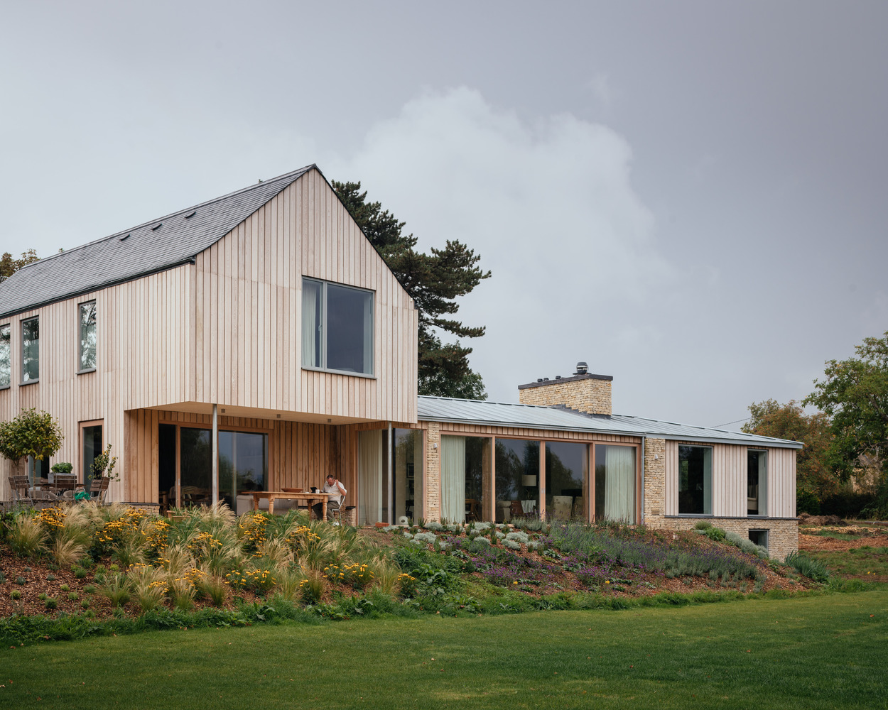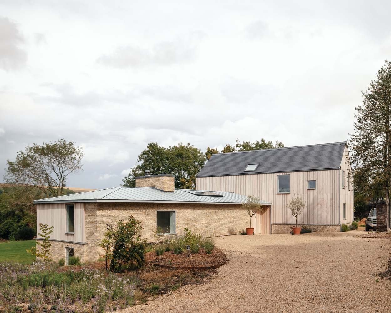 Cotswolds House comprises two intersecting pitched volumes that form an L-shape plan, clad in local Cotswold stone and larch, topped with zinc and slate roofing.