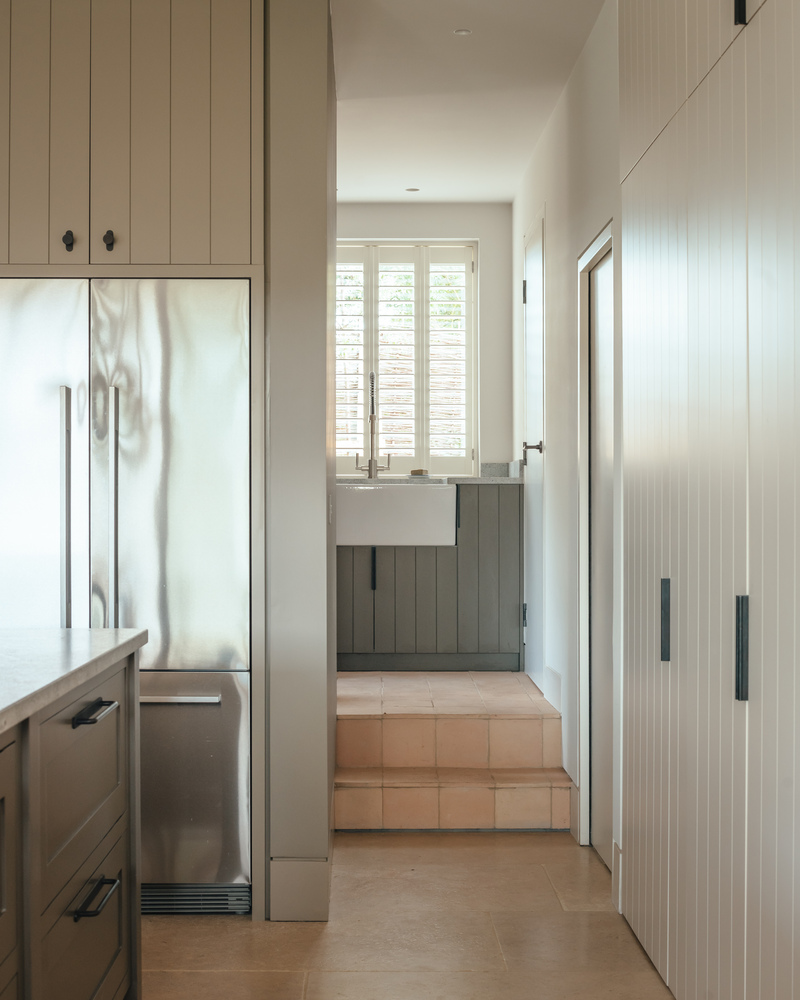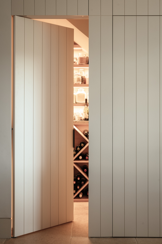 A well-equipped kitchen is flanked by a hidden walk-in larder, making clever use of under-stair space.