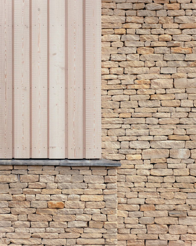A natural palette of stone and larch tie the exterior language of the home into the village setting, where stone homes are traditionally the norm.