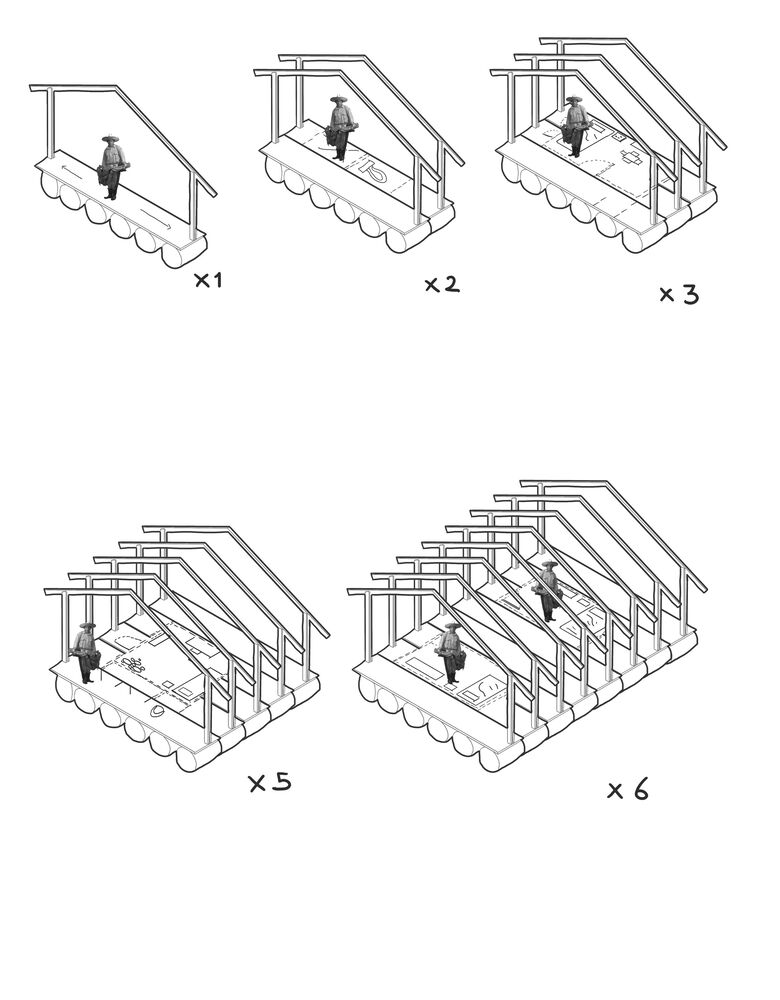 The system consists of floating platforms, replicable wooden truss modules that can be expanded or reduced according to each inhabitant’s specific needs, floodable walkways, dry toilets, and filtration systems that ensure permanent access to clean water.