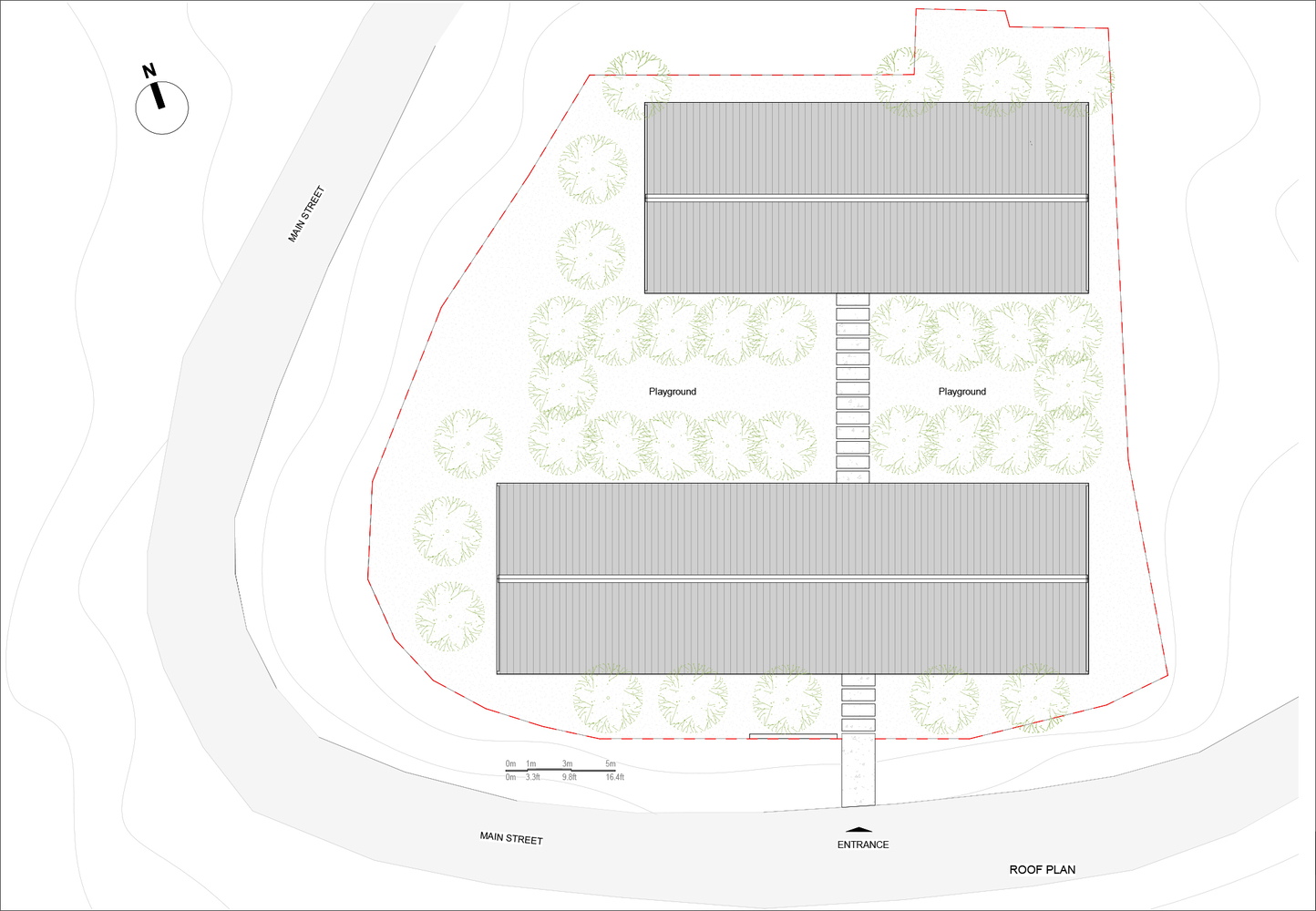 With a strong intention to preserve the existing green landscape and harmonize with nature, the classrooms and buildings are arranged to open their windows toward the surrounding forested mountains.