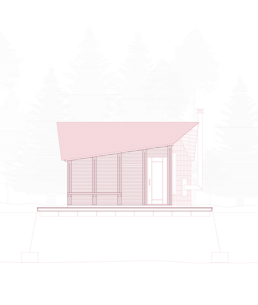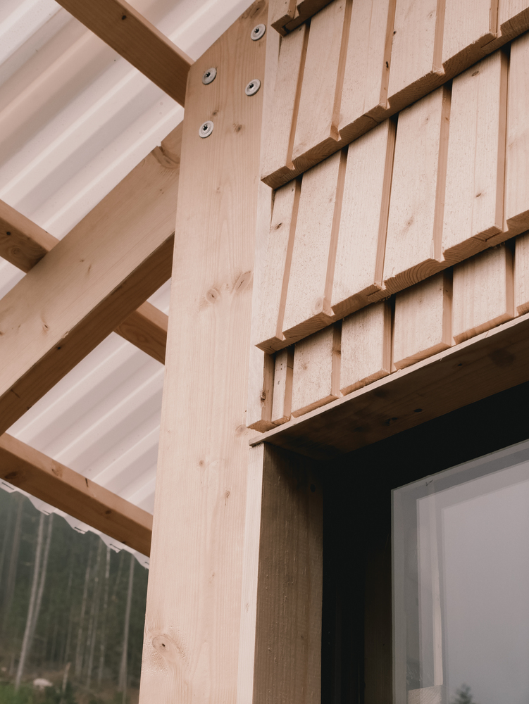 Leftover panels were cut into shingles and used to clad one side of the sauna, adding texture and rhythm to the exterior. Every part of the building carries the mark of improvisation and care.