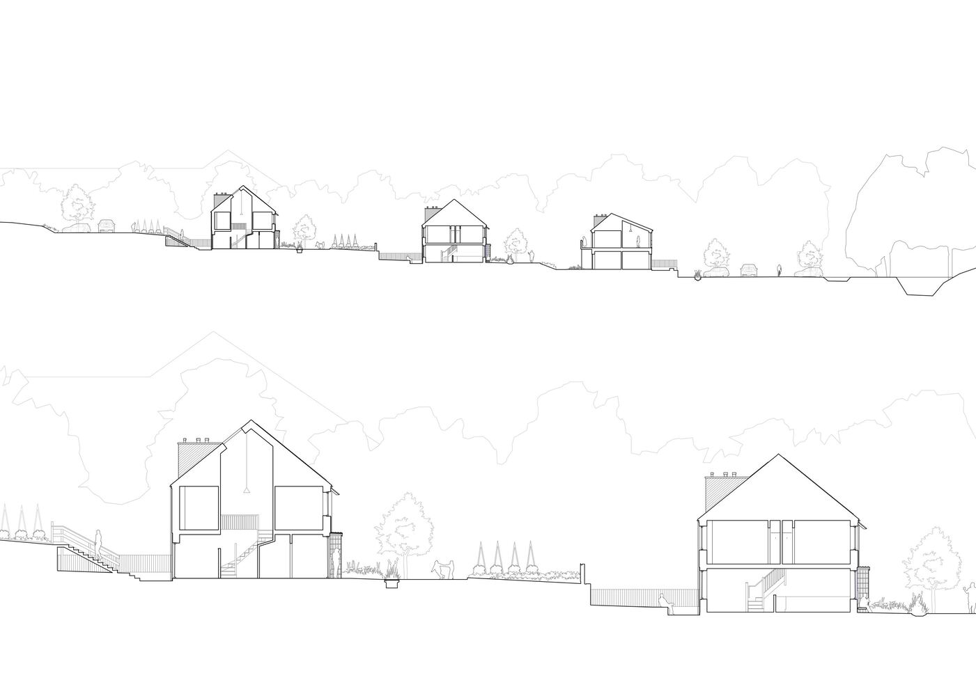 The homes are nestled into the hillside, the terraces following the land's contours and drawing attention outward towards views of the Area of Outstanding Natural Beauty.