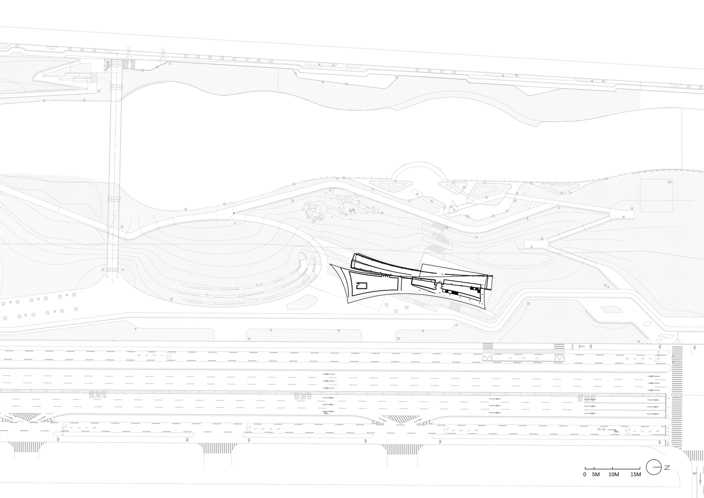 The building is designed to "flow," "stretch," "rotate," and "open" along the natural texture, interacting with the landscape's topography to enhance spatial continuity and vitality.