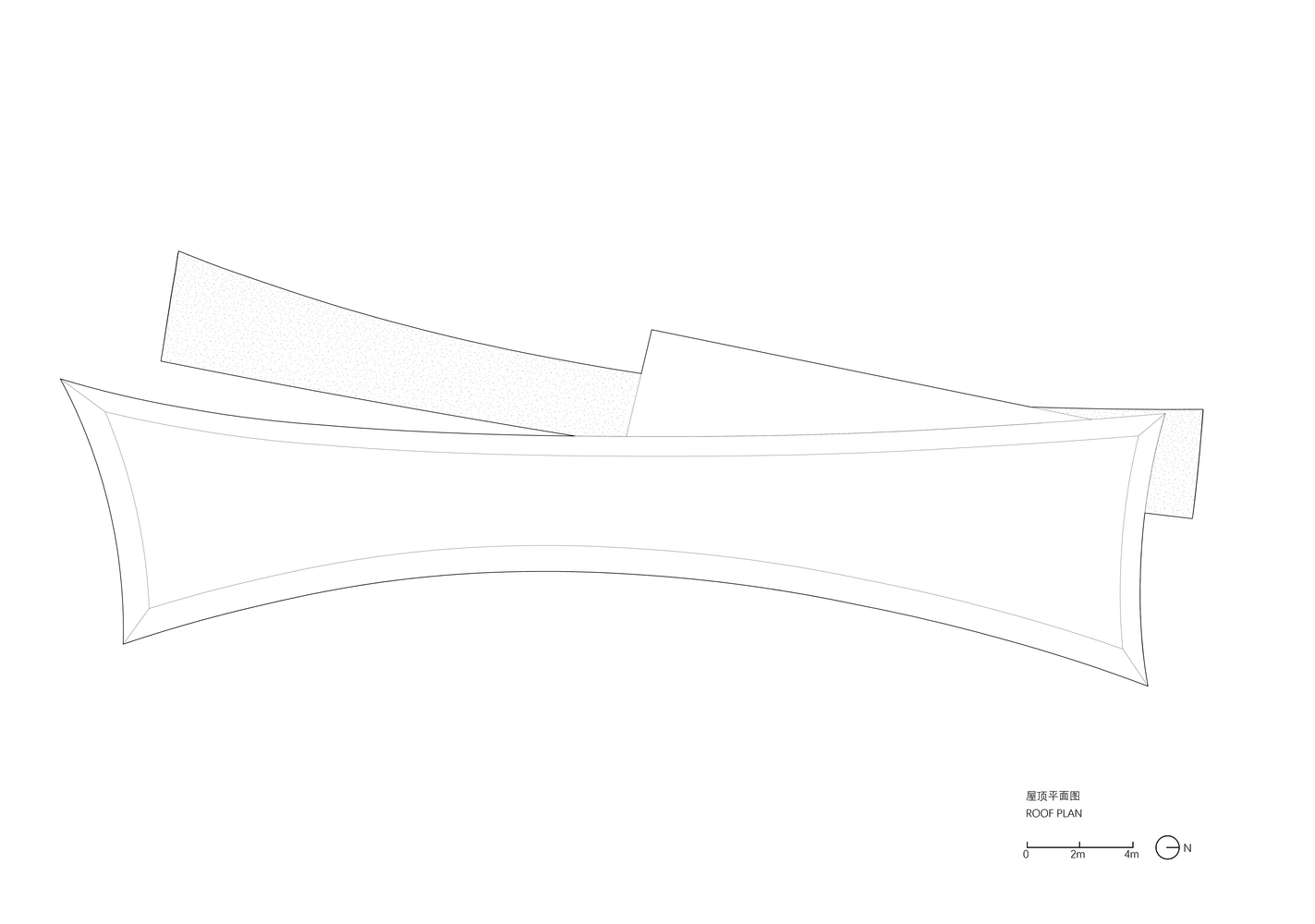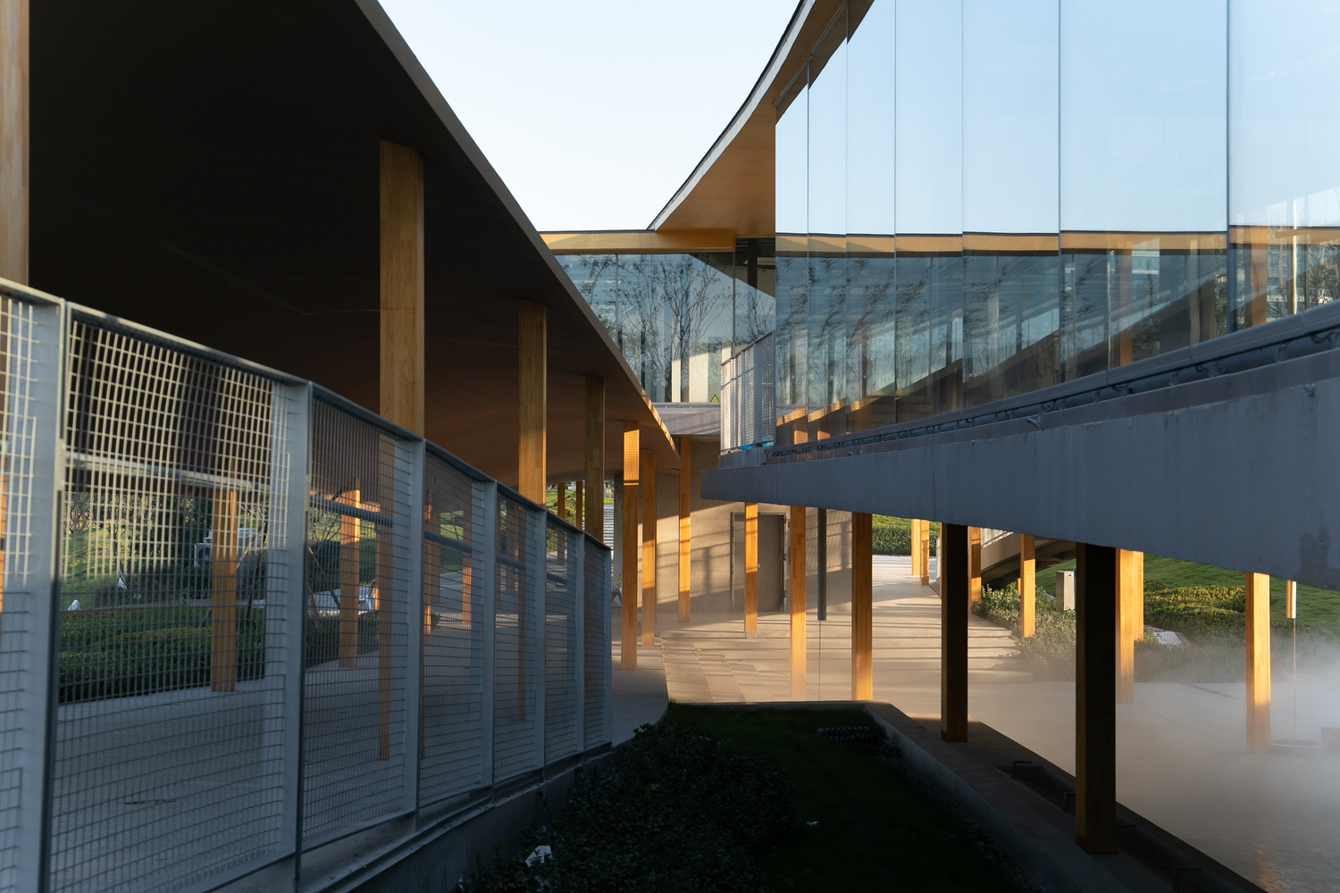 Building No. 4 sits on a long, sloping site. A hyperbolic plate truss is employed to make the landscape experience tangible and to extend it.