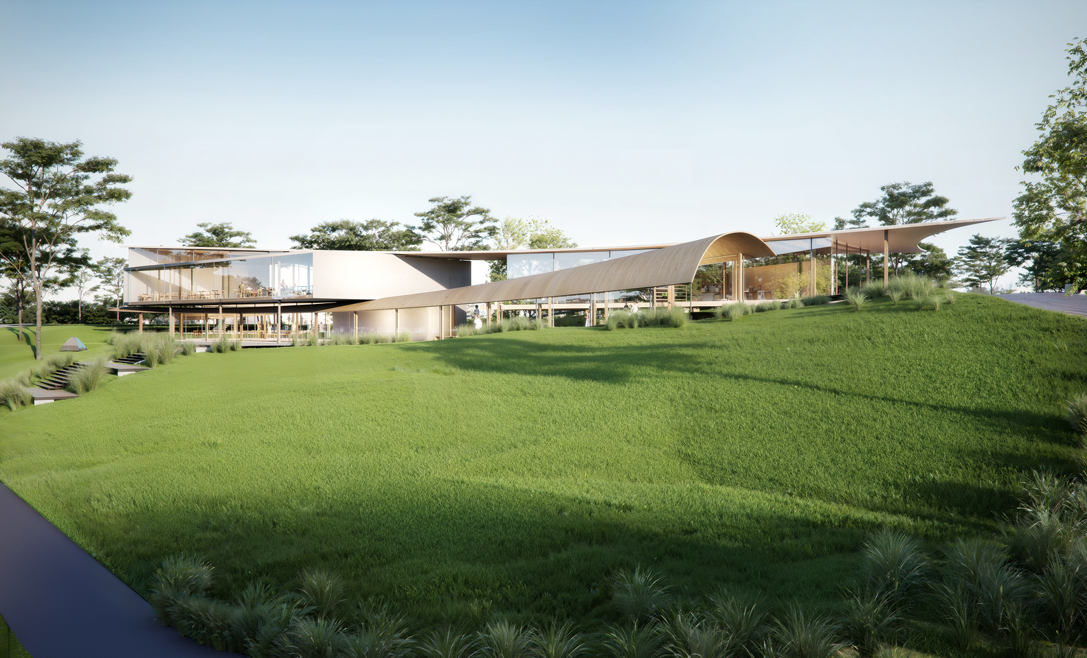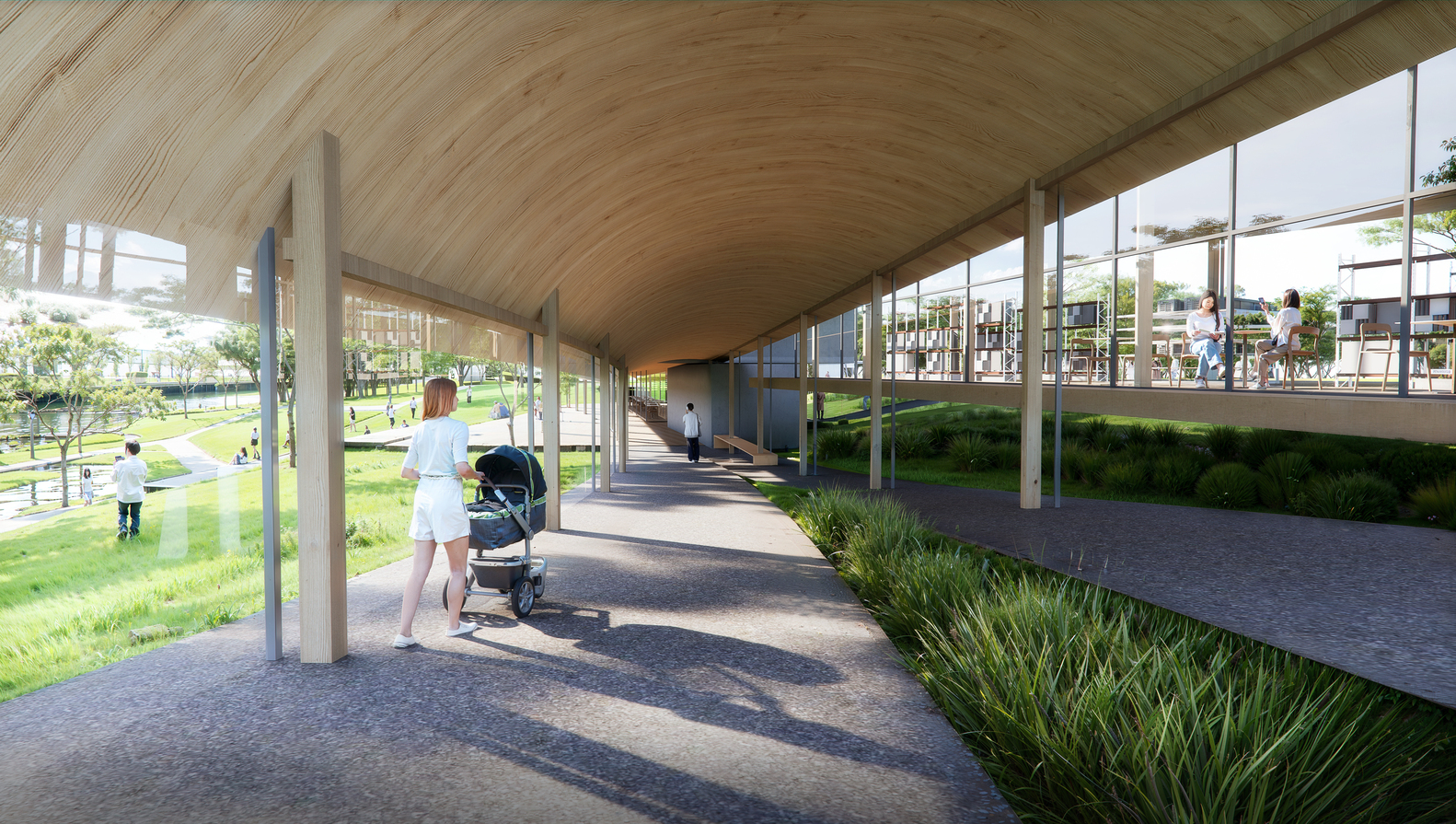 All these flows converge beneath a soft, curved canopy, creating a spatial carrier that continuously engages and permeates the surrounding landscape.