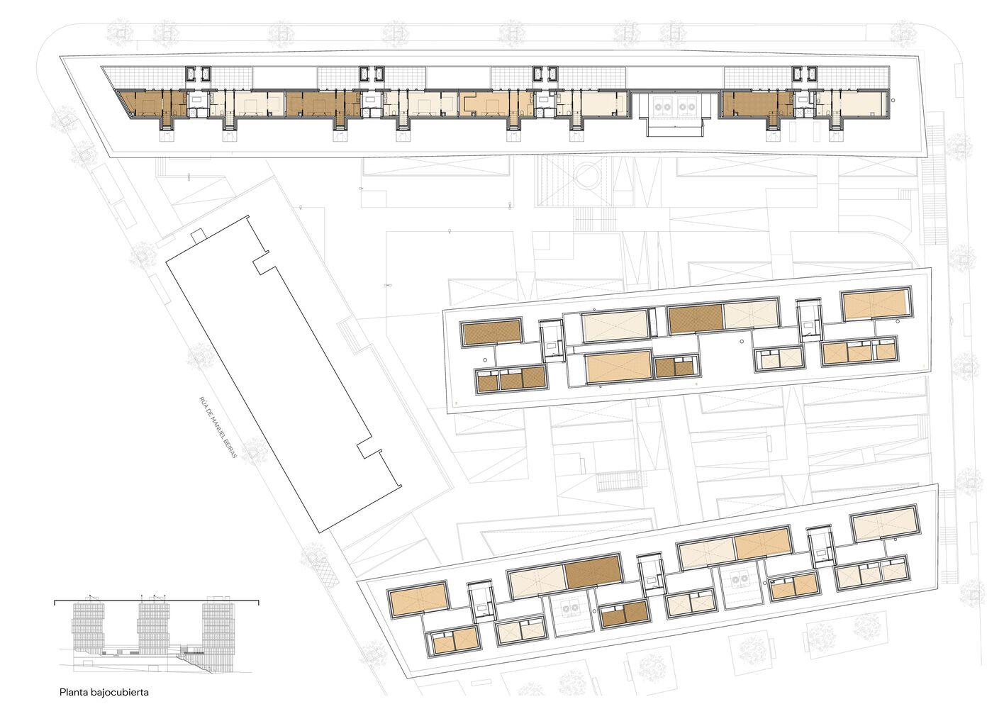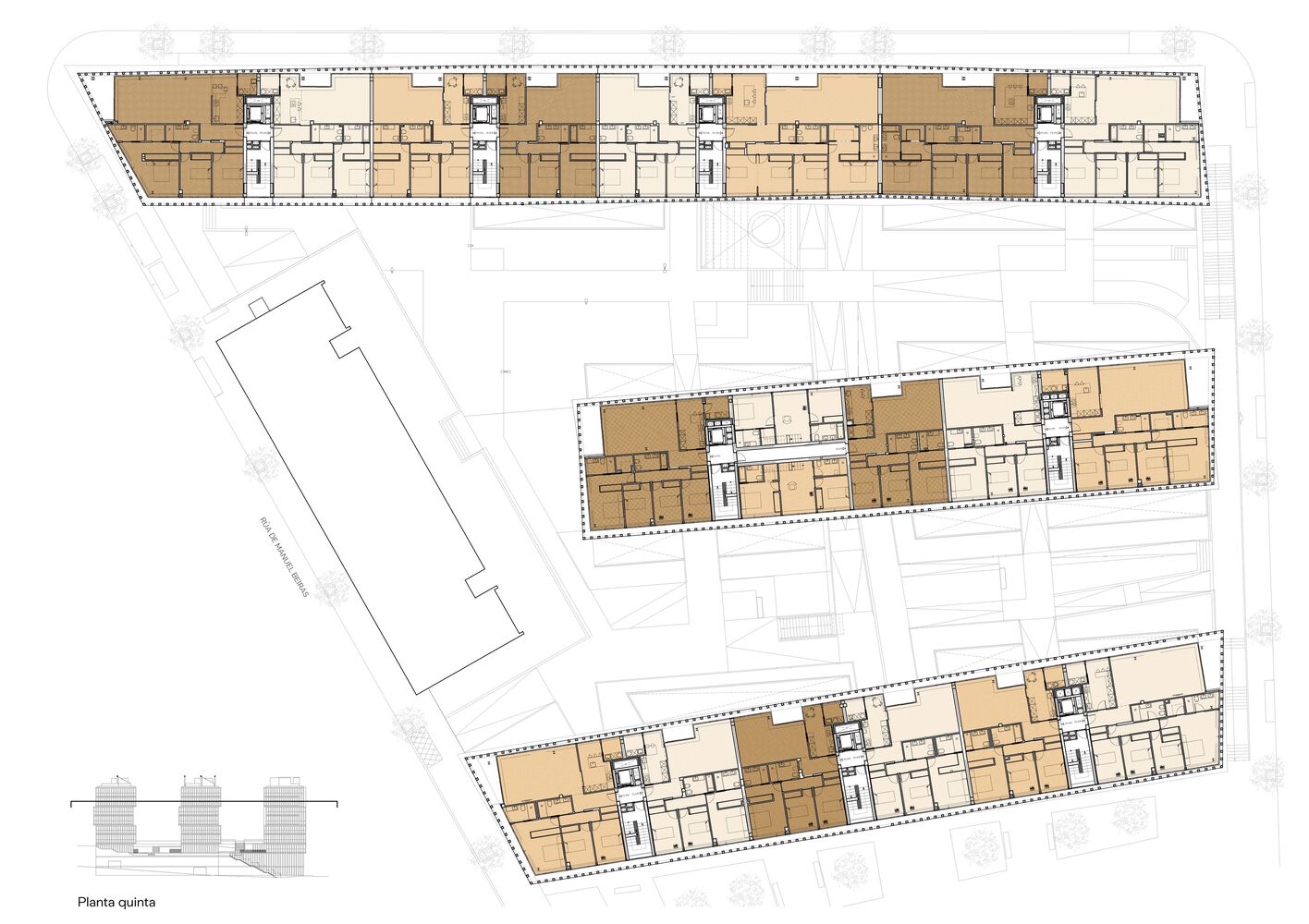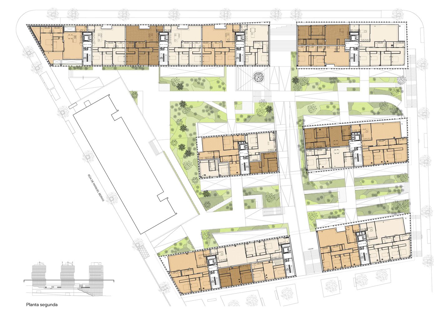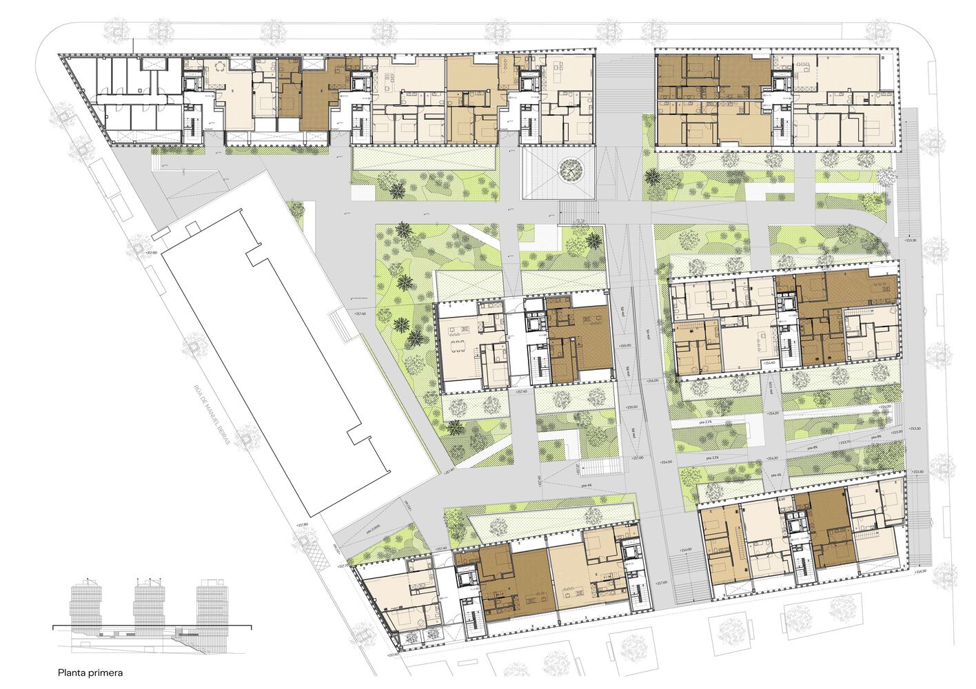 The set is complemented by the provision of a transversal passage through the buildings that frees up the transversal views and decompresses the space between buildings.