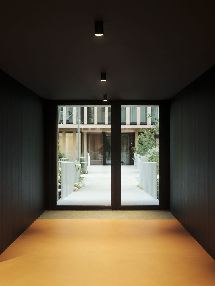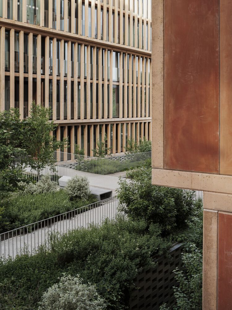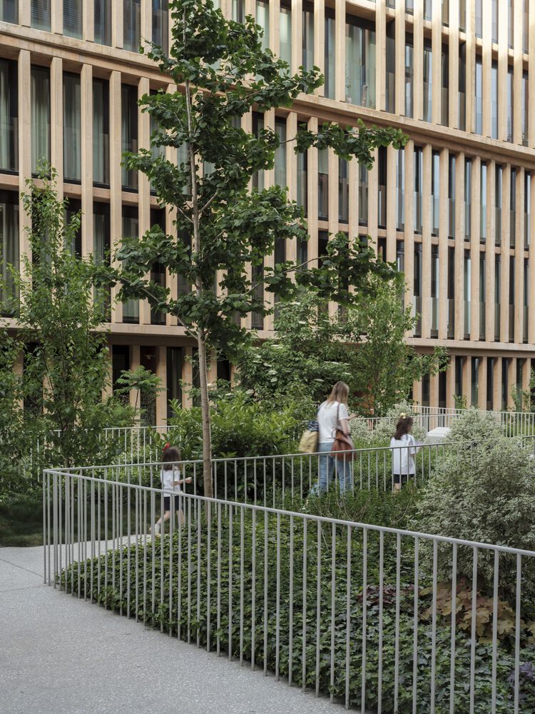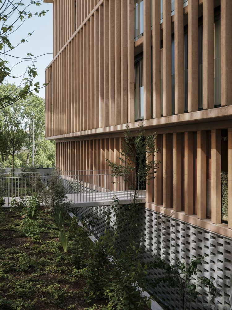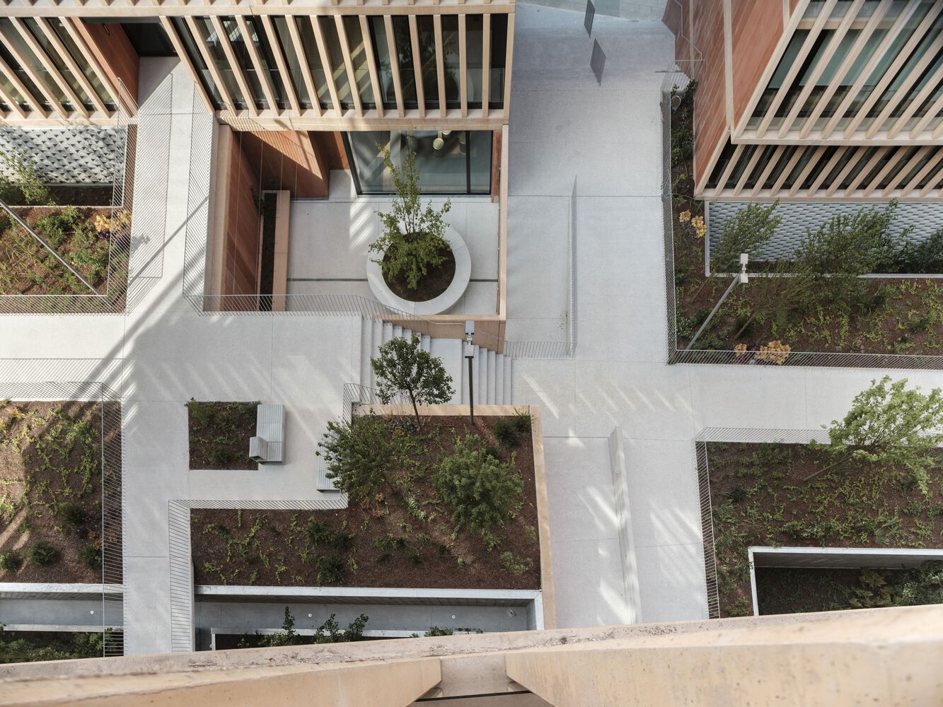 A series of voids are incorporated into this space towards the floors below ground level, allowing the facades to be "distanced" from the apartments and enabling the incorporation of larger trees and natural ventilation and lighting of the spaces for garages and storage rooms.
