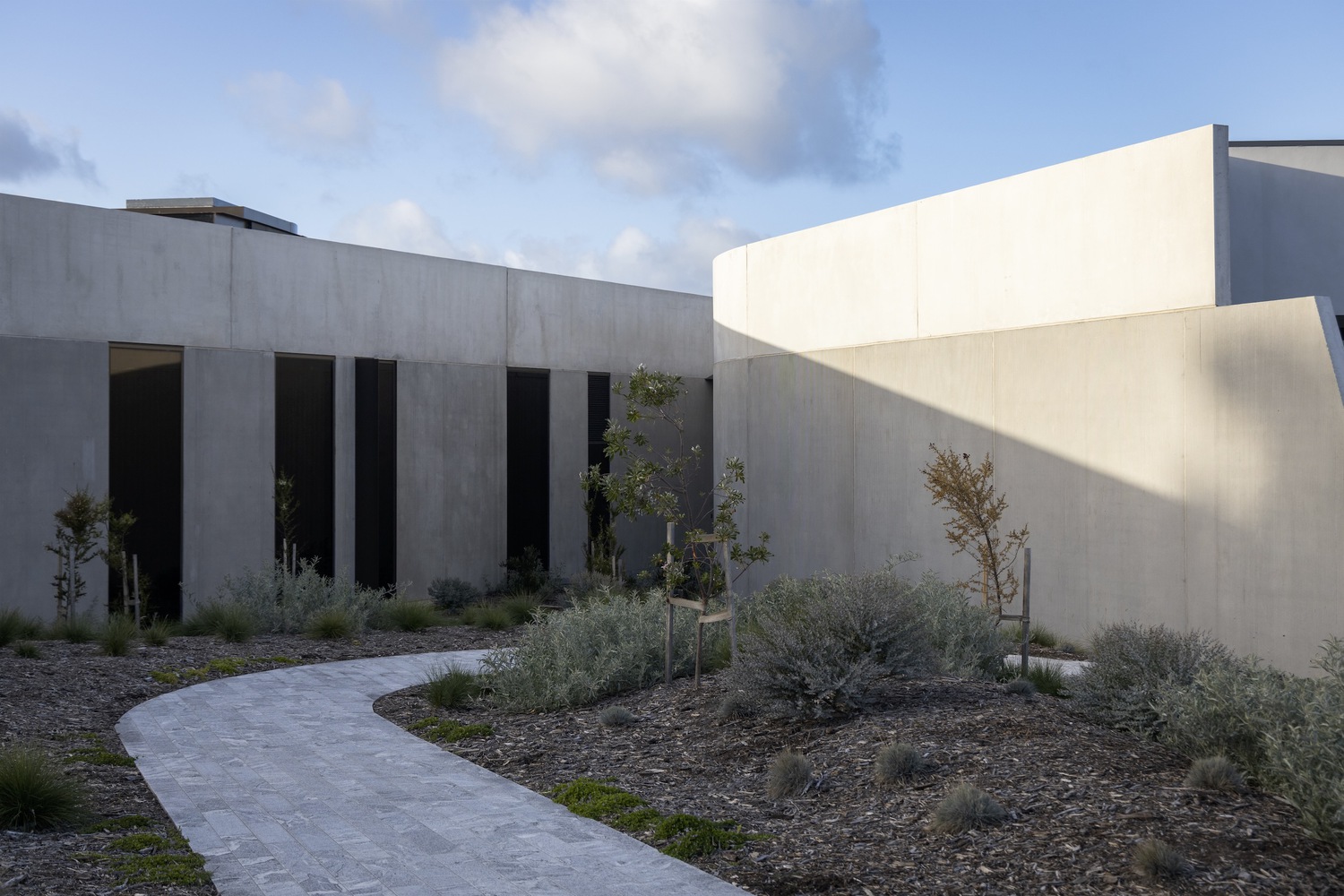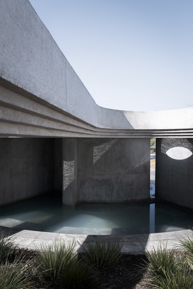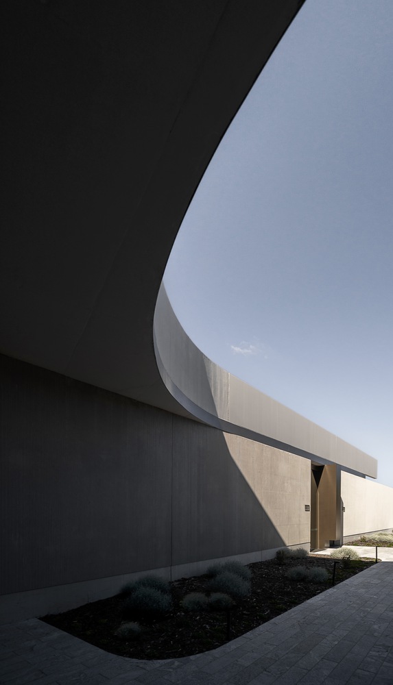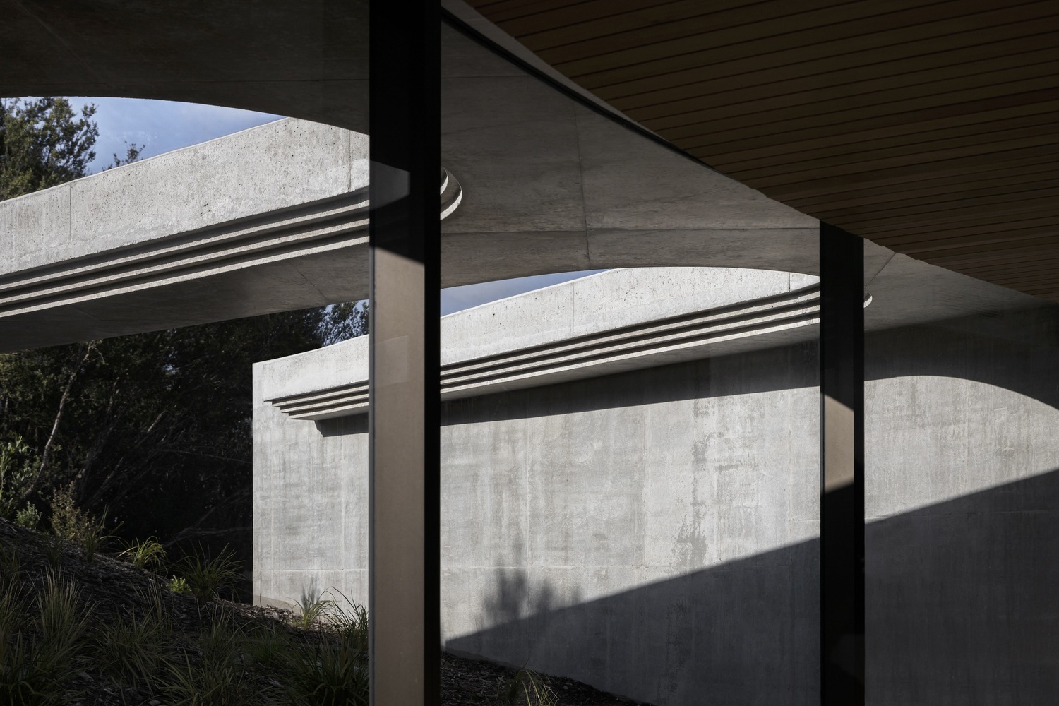 The curved concrete walls express the purity of form, delineating the spaces and cutting through the landscape creating sunken courtyards and curating opportunities for light and shadow.