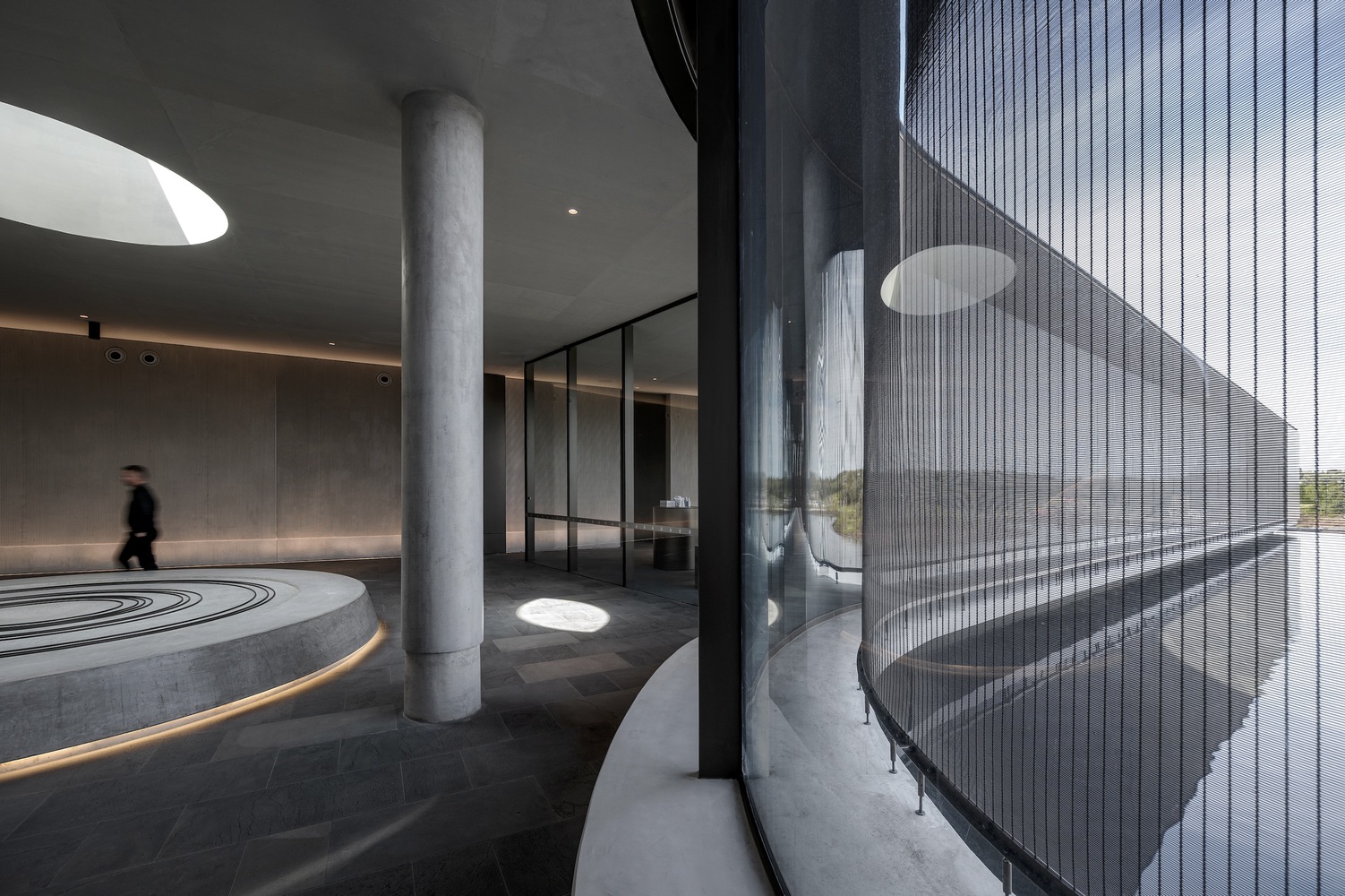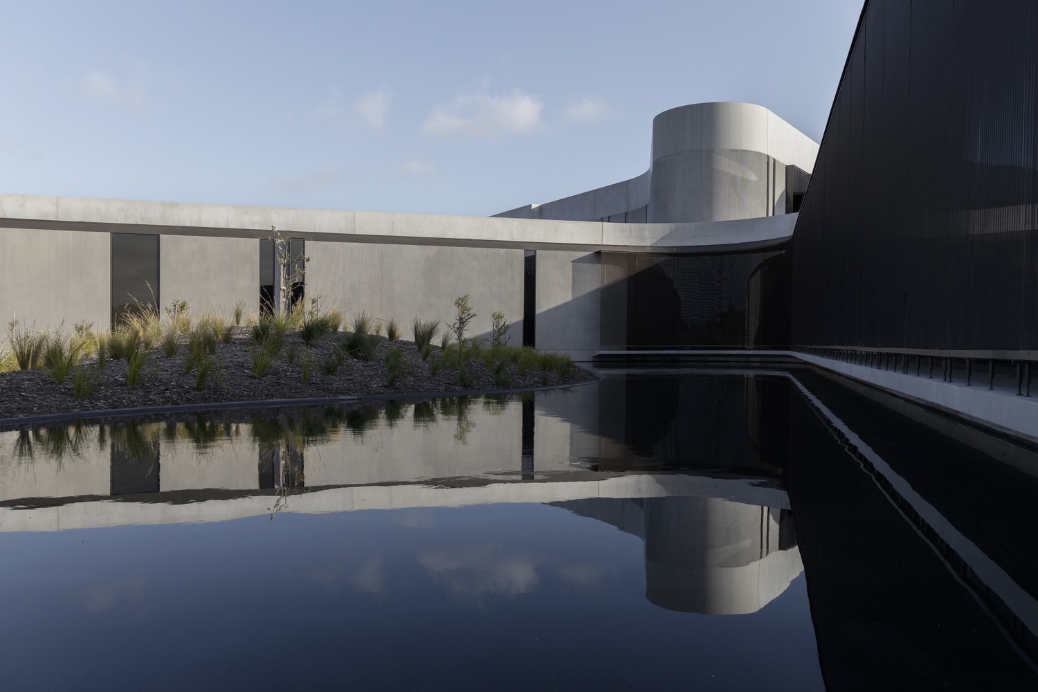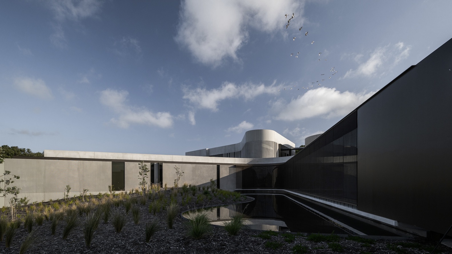 The curved concrete walls express the purity of form, delineating the spaces and cutting through the landscape creating sunken courtyards and curating opportunities for light and shadow.
