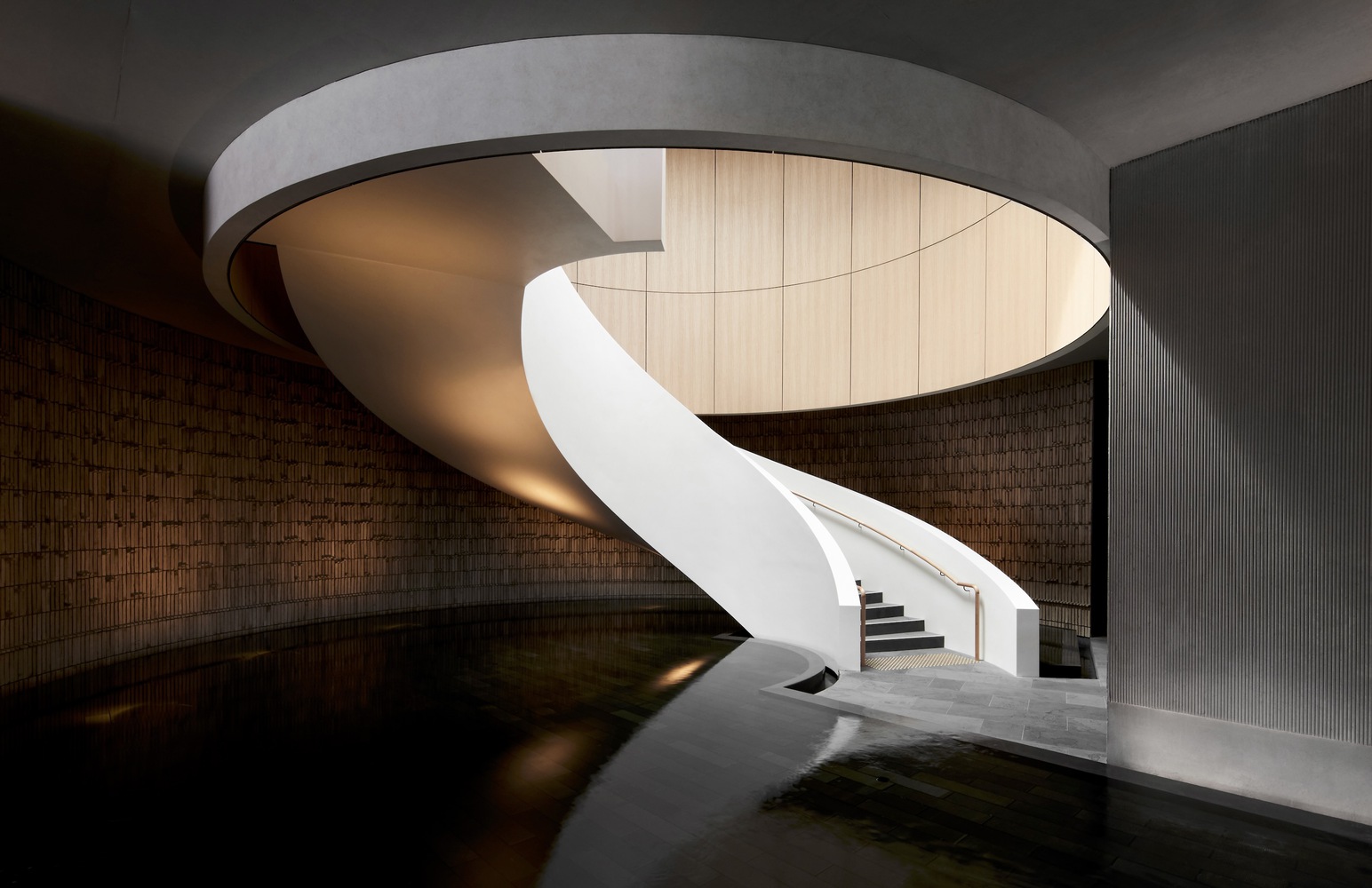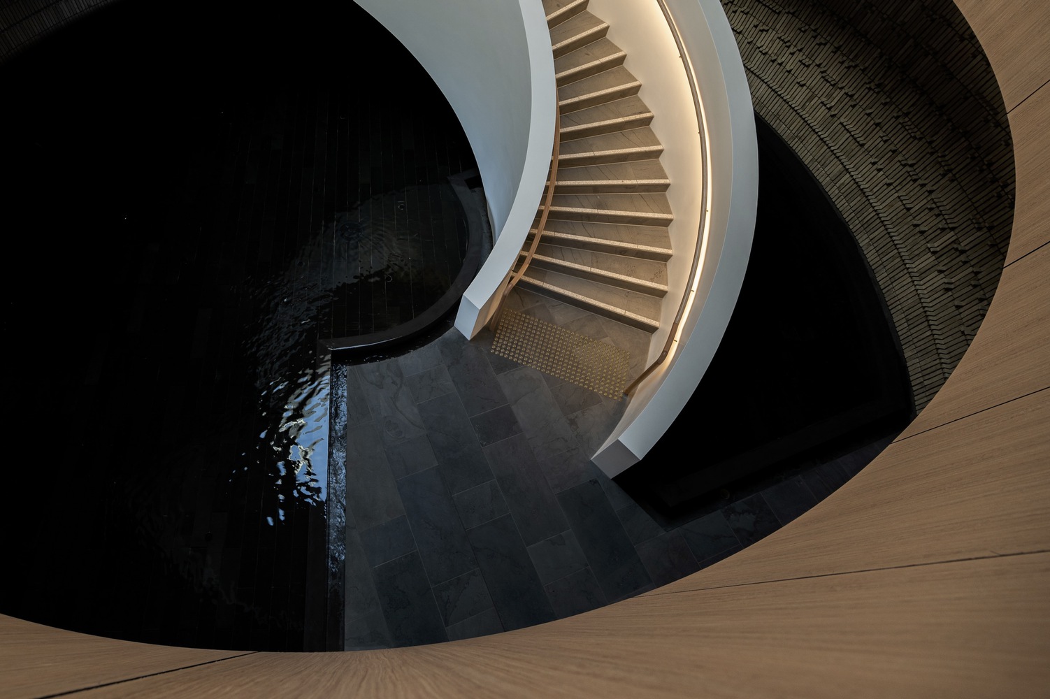 Celebrating the process of arrival, a spiral stair rises from a reflective indoor pool as a sculptural feature and as a mechanism to demark the public and private spaces.