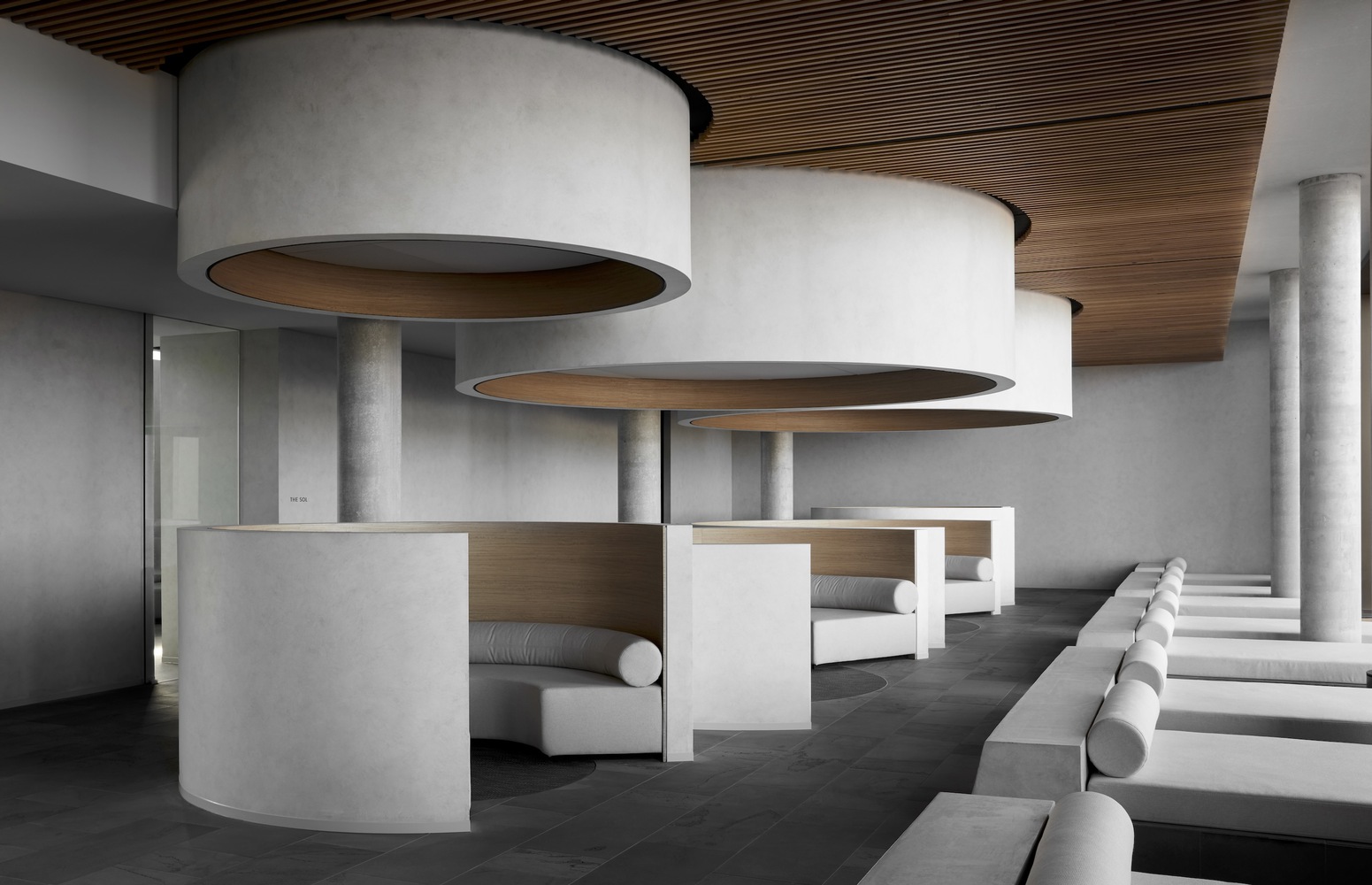 Elements of the native landscape such as Bottlebrush seed pods, Eucalyptus gum nuts, and seashells are referenced in the relaxation lounge and spa treatment rooms.