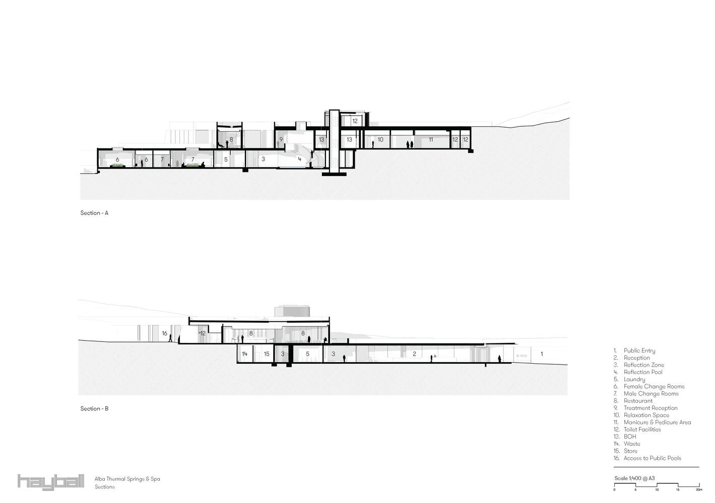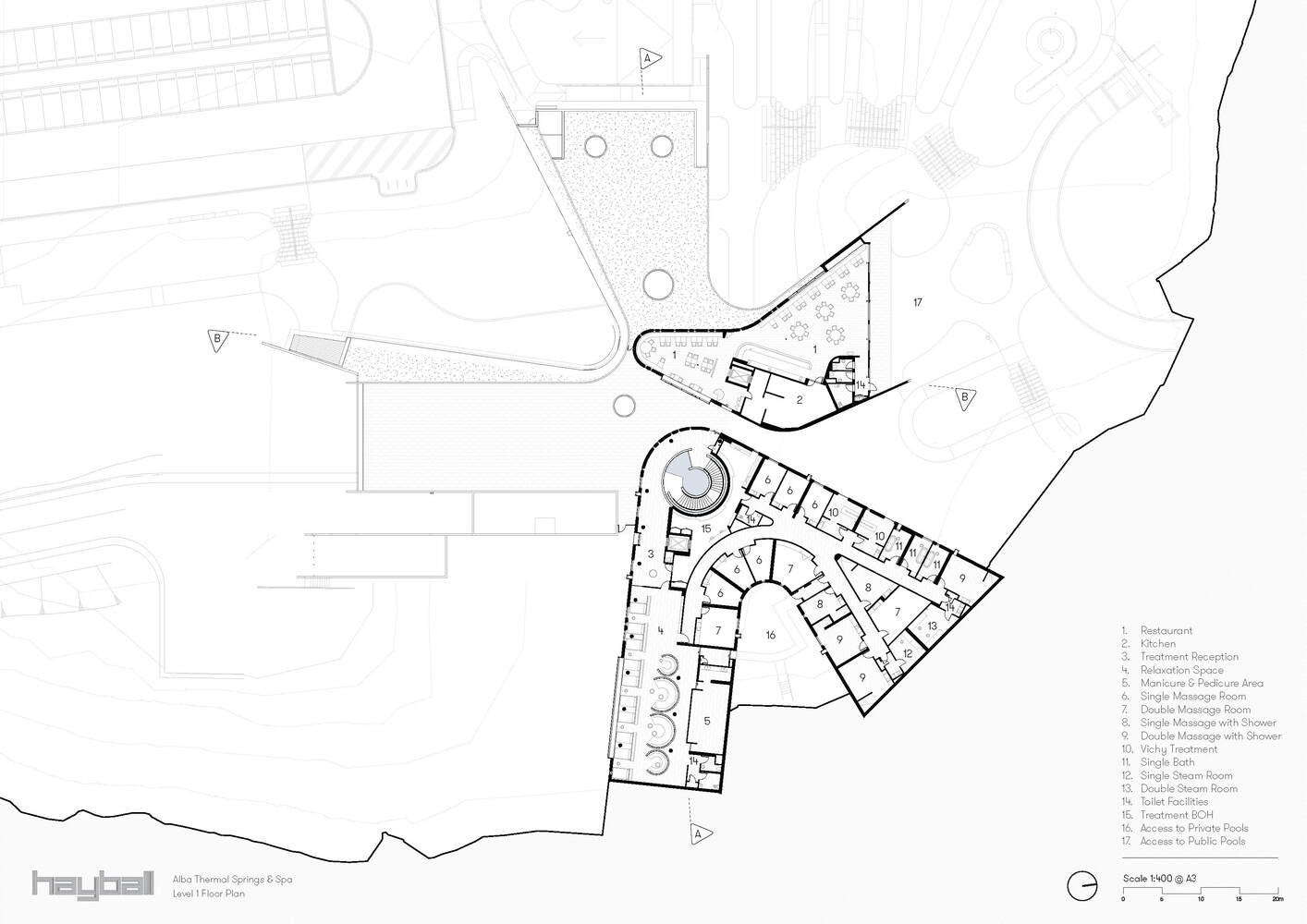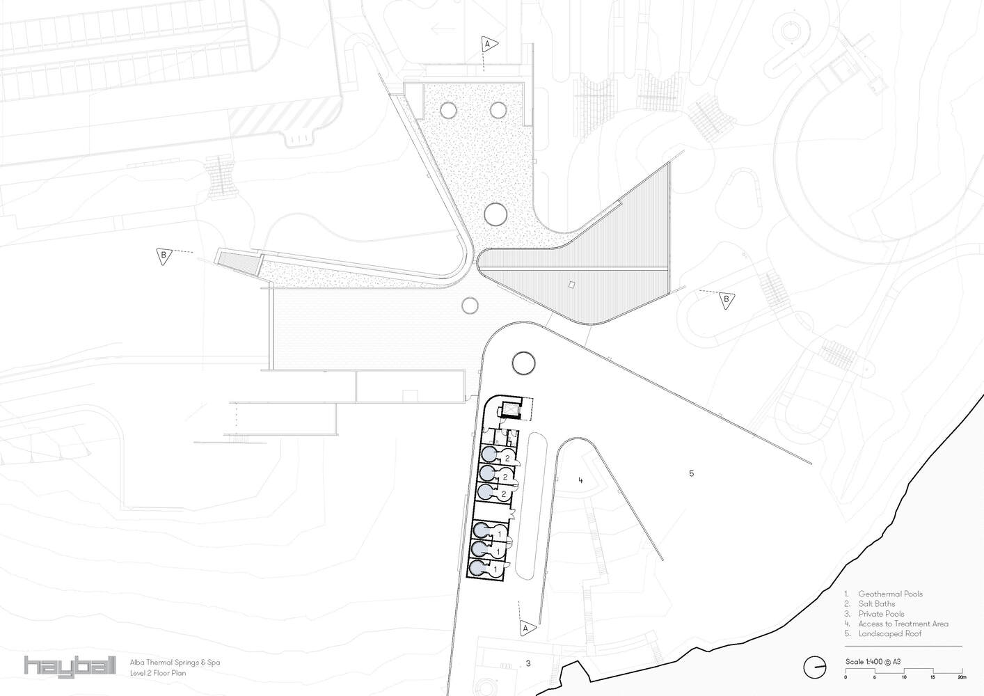 Pinned off a meandering stone path, the bathing experience at Alba sees all pools forming a family of simple geometries, allowing intuitive wayfinding, dispersion, and equity of bathing experiences, the efficiency of operations, and reliability of materiality.