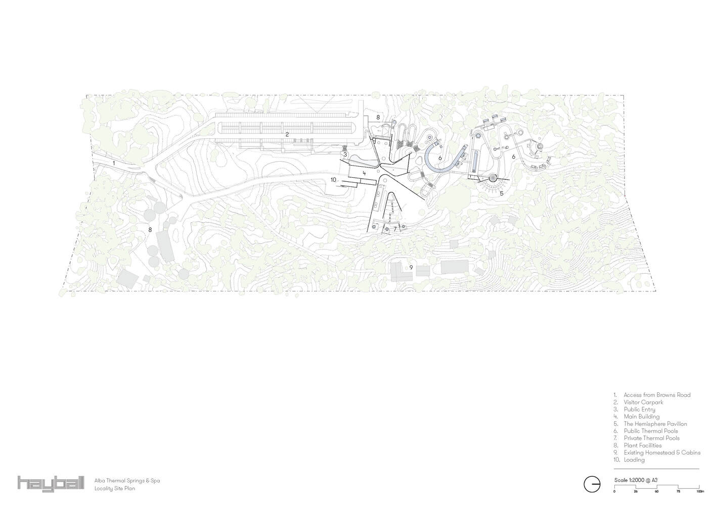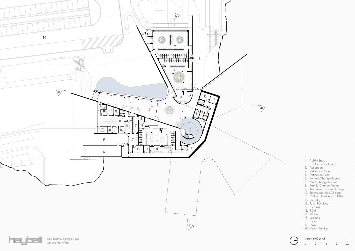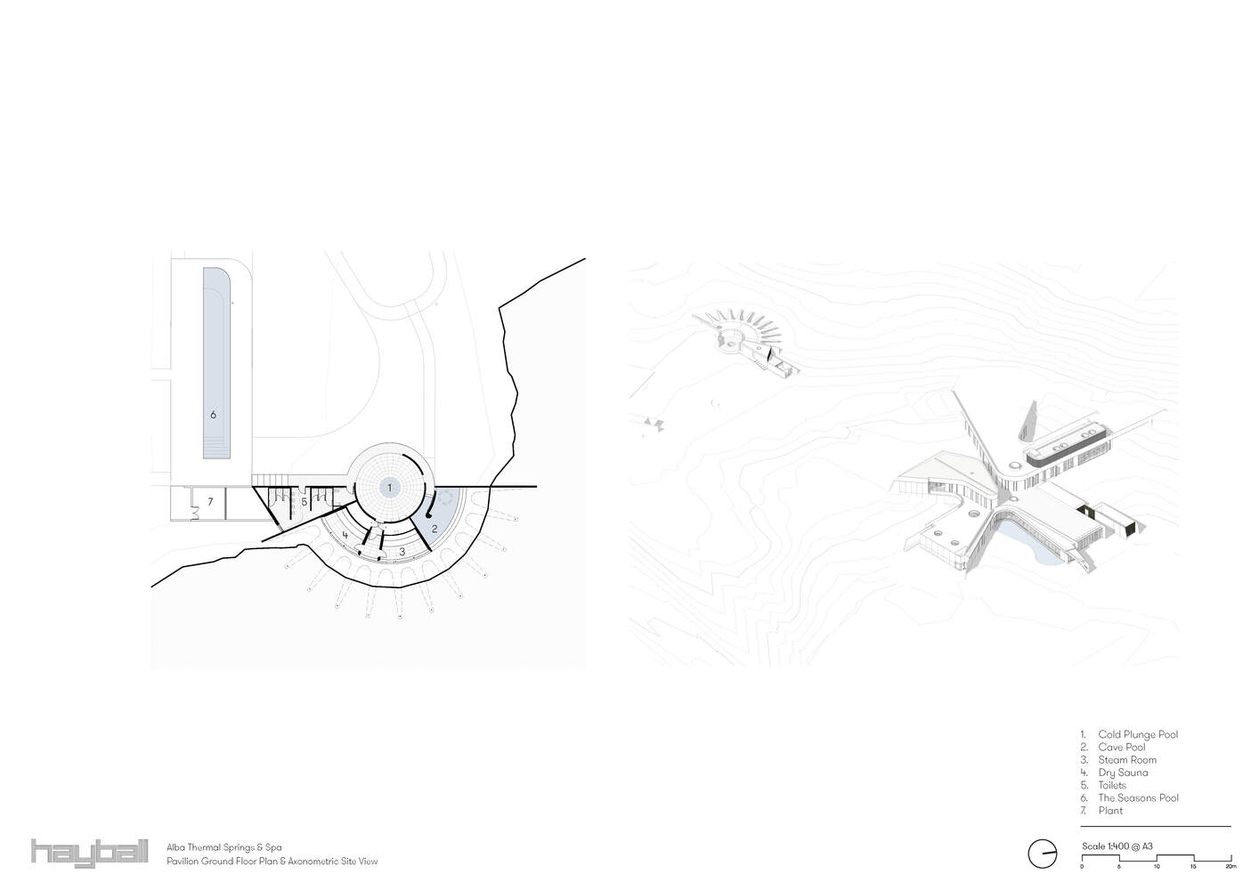 Pinned off a meandering stone path, the bathing experience at Alba sees all pools forming a family of simple geometries, allowing intuitive wayfinding, dispersion, and equity of bathing experiences, the efficiency of operations, and reliability of materiality.