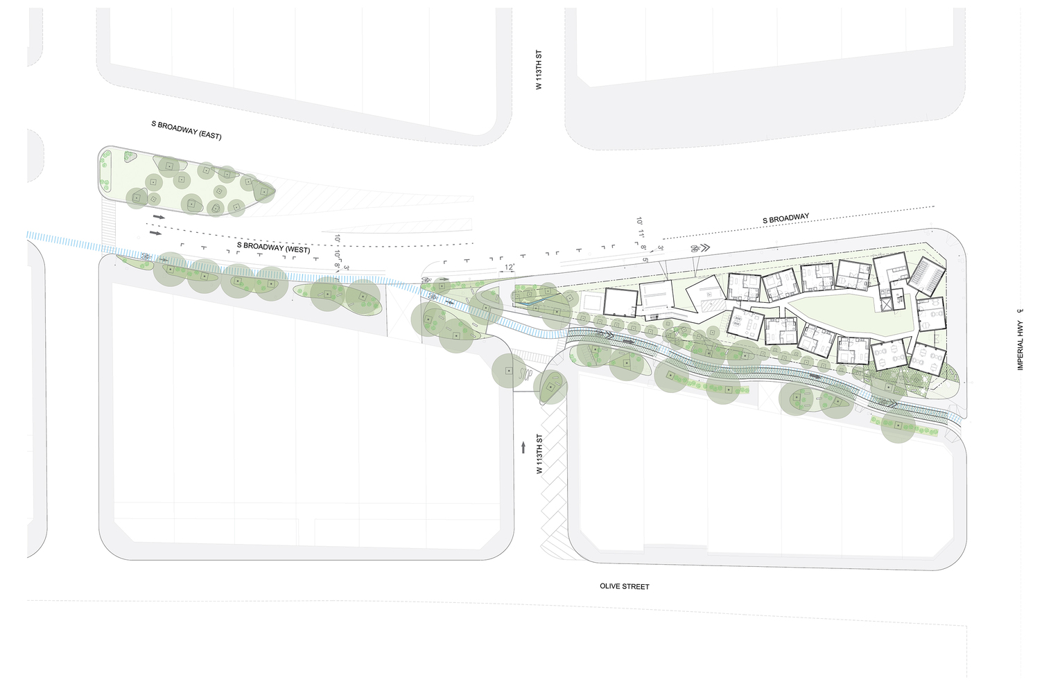 While the project is predominantly residential and green space, the ground level along the paseo will provide storefront spaces for retail, incubation and job training, support services, and administrative offices.