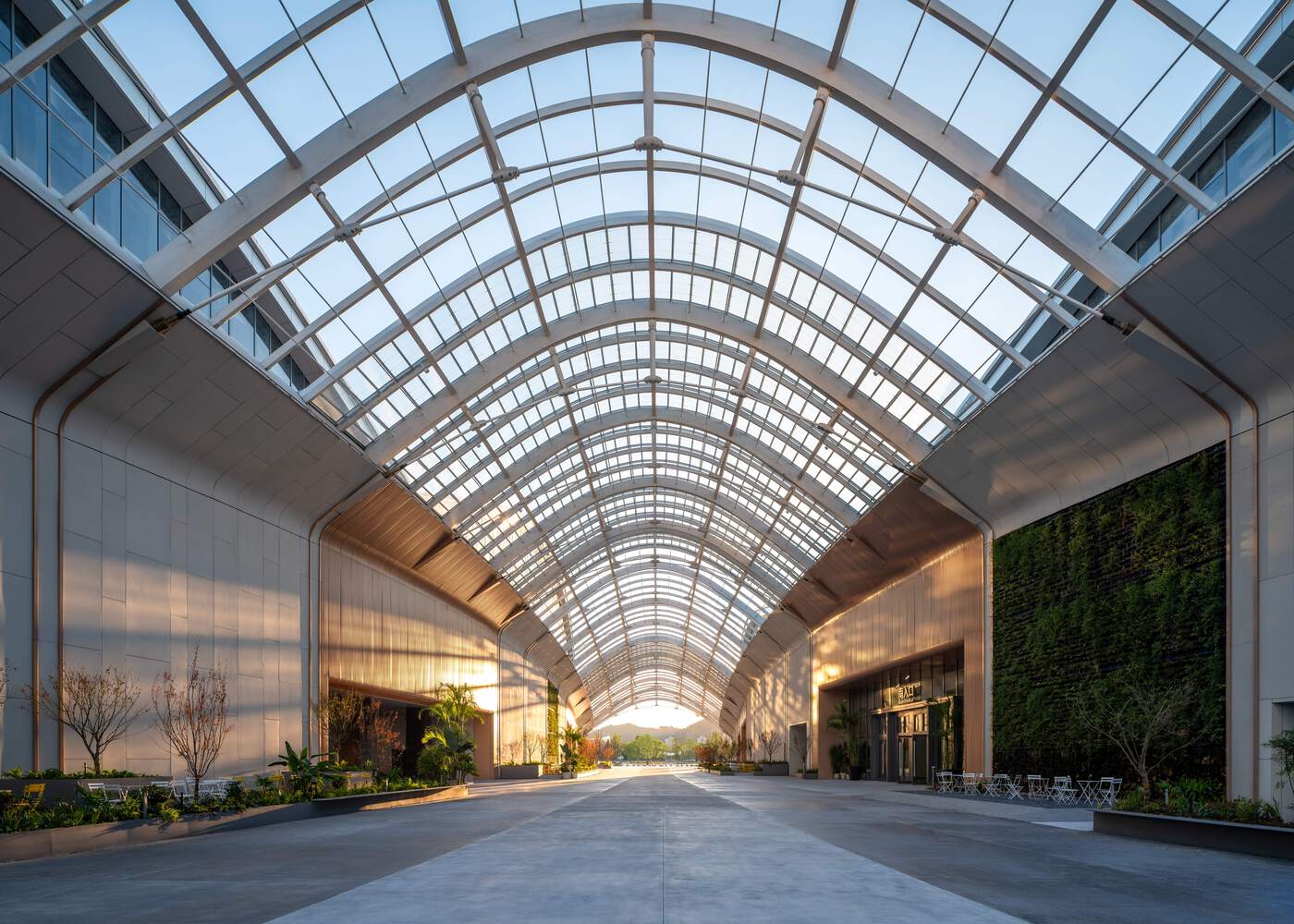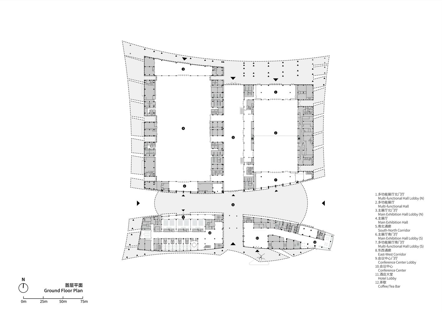 Flanking this north-south axis are the 10,000-square-meter main exhibition hall and the 5,000-square-meter multi-functional hall.