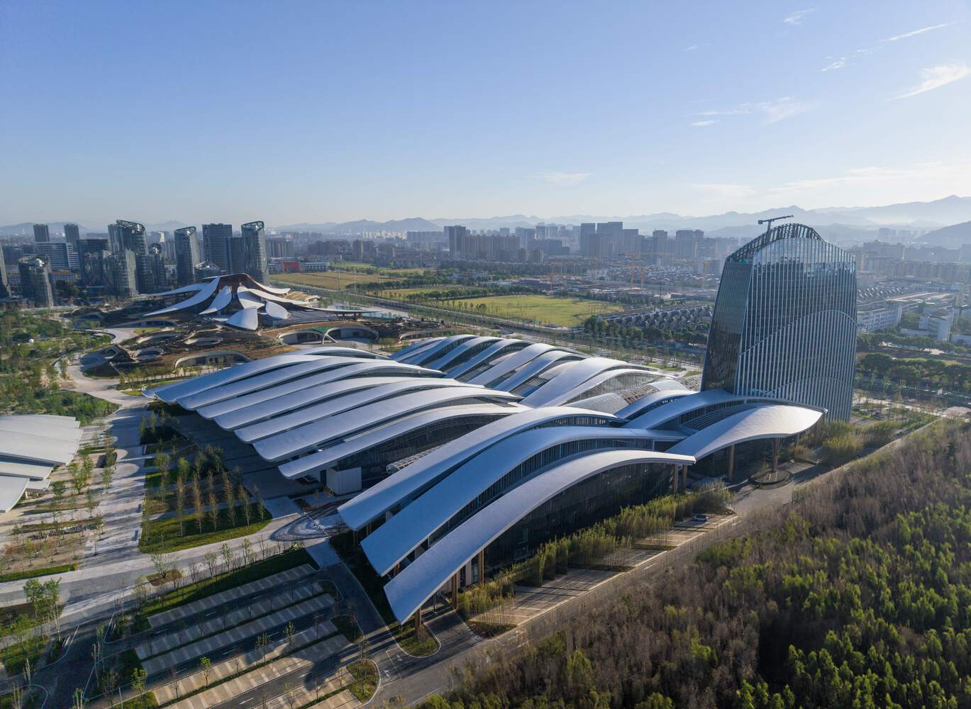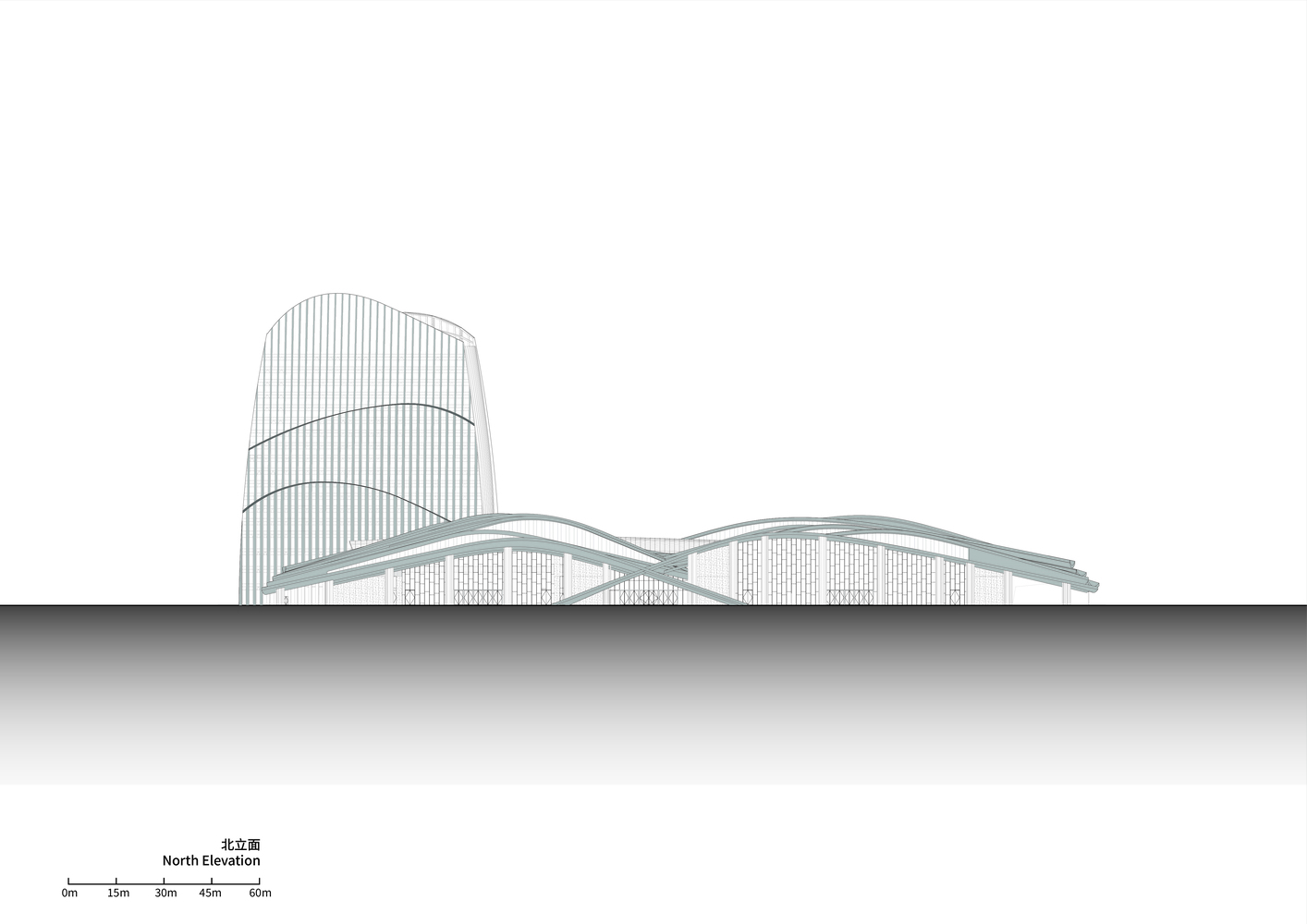 The exhibition hall is located north of the corridor, and the hotel functions to the south. A lightweight yet robust structural design ensures unobstructed views of the mountains and water along this urban landscape axis.