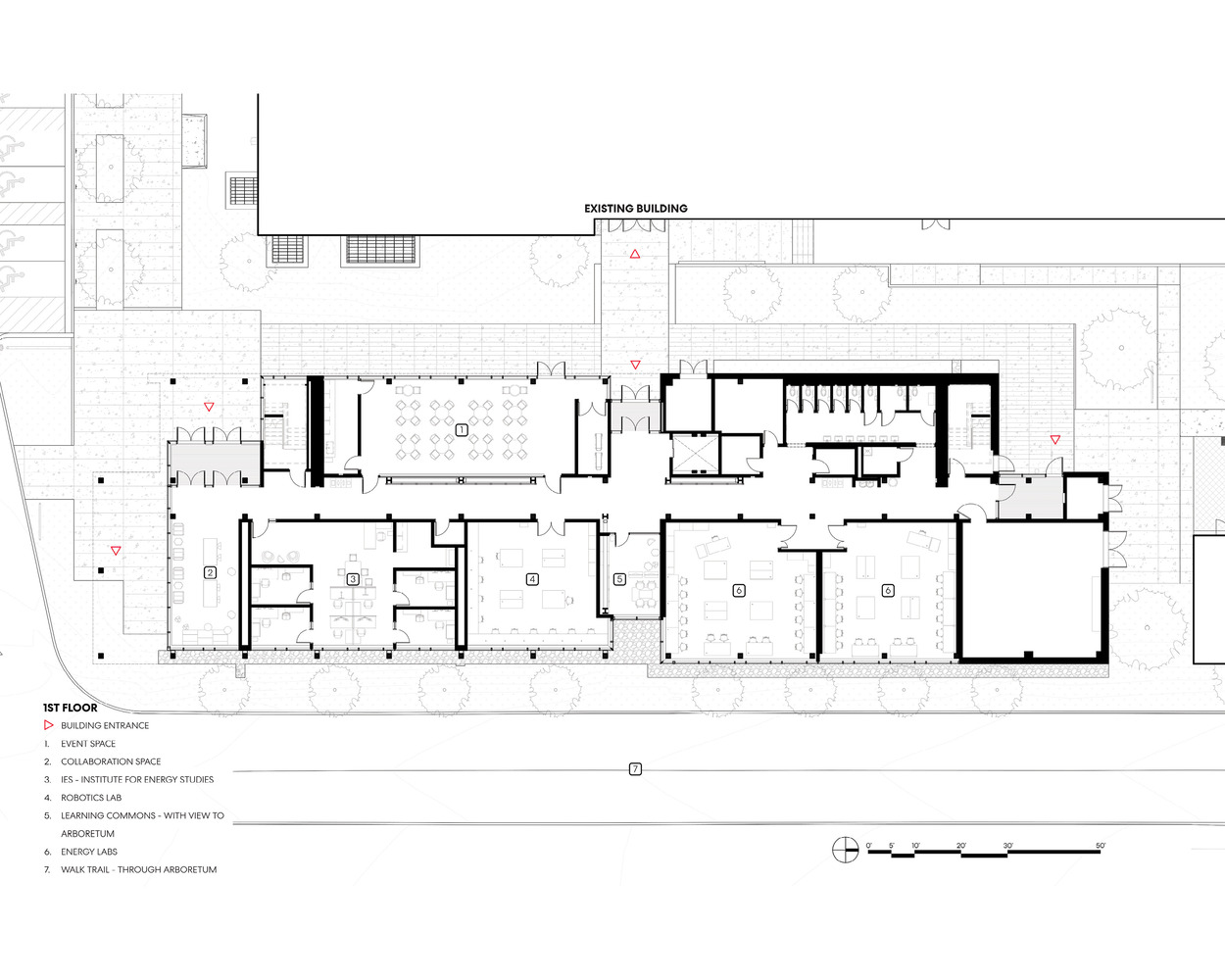 Horizontal windows punctuated by panels of natural finish wood provide views and daylight for the classrooms and offices on every floor. On the ground floor, an airy lobby with a central stair draws students up through the Hall, while glass walls allow sightlines to sweep the campus, strengthening the building's biophilia and connection to the arboretum.