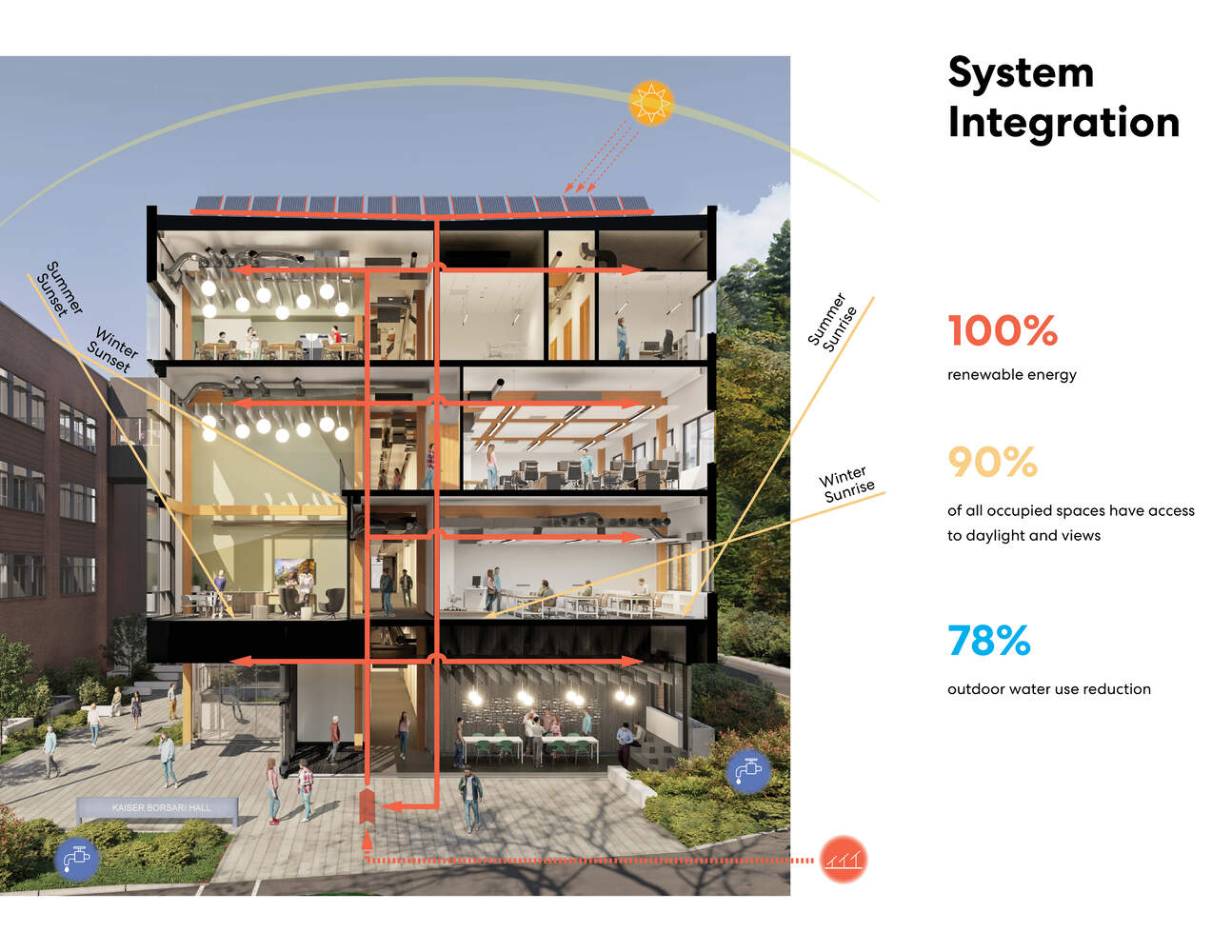 Kaiser Borsari Hall provides a home for these new departments and creates multi-disciplinary learning environments and collaboration, teaming, and office spaces that foster innovation, investigation, and inspiration.