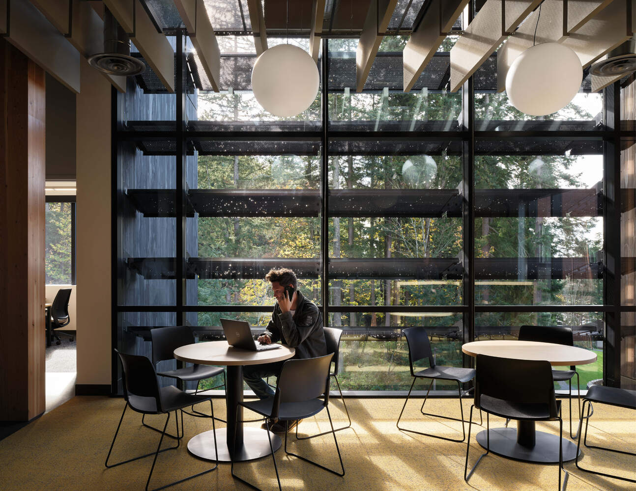 Positioned between the main campus and the native forest arboretum, the building boasts a mass timber structure with a visually striking contrast between warm wood tones inside and charred wood siding outside.