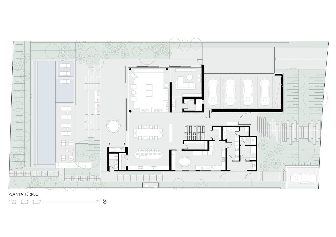 In addition, the carefully selected finishes reinforce the unity of the residence with the greenery, using slatted concrete and light-toned modular stone.