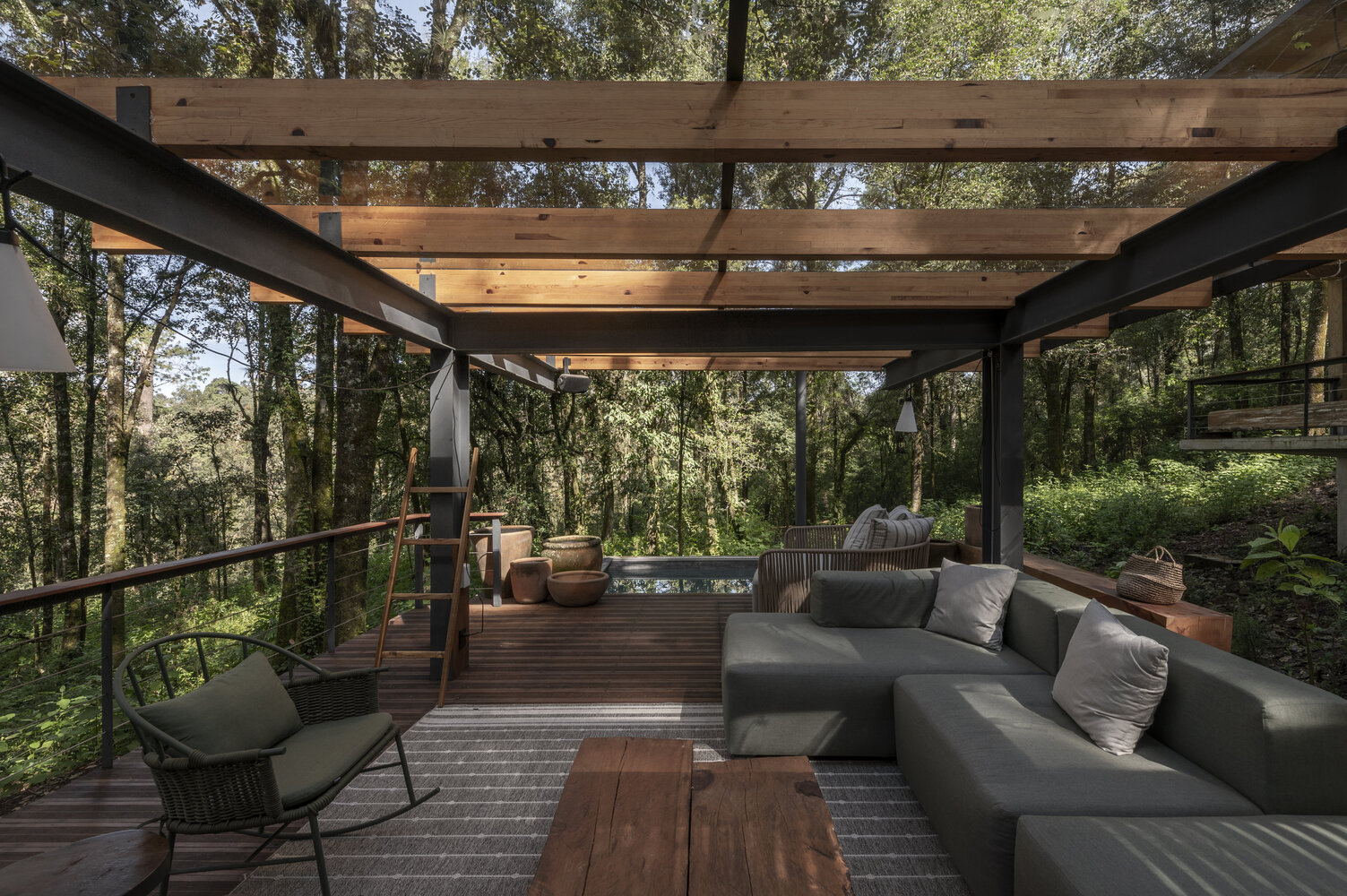 Its central location on the property ensures 360-degree views of the forest, making the landscape the undeniable protagonist of the space.