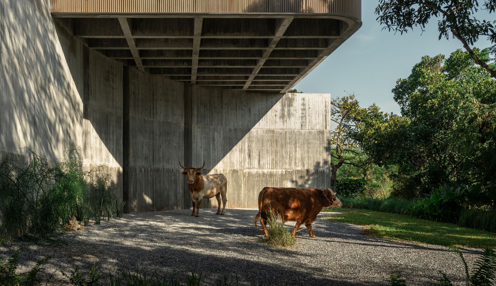 It's as if the house has been lifted on stilts, creating a two-story effect, while leaving the ground level as a garden and open space for the cows.