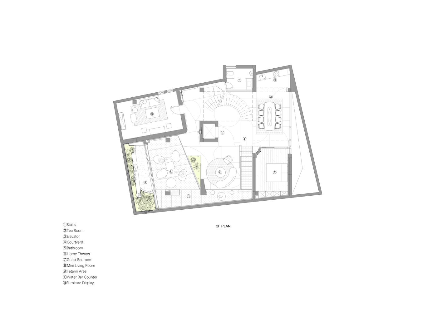 The second floor represents an innovative interpretation of courtyard living - an entirely internalized "fifth courtyard" containing a home theater and multifunctional zones organized around a central terrazzo "pond" with inlaid brass ripples.