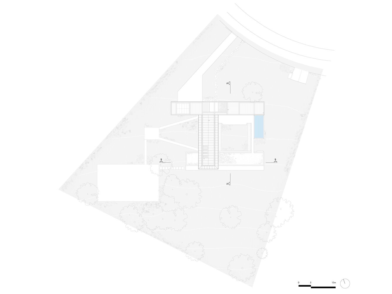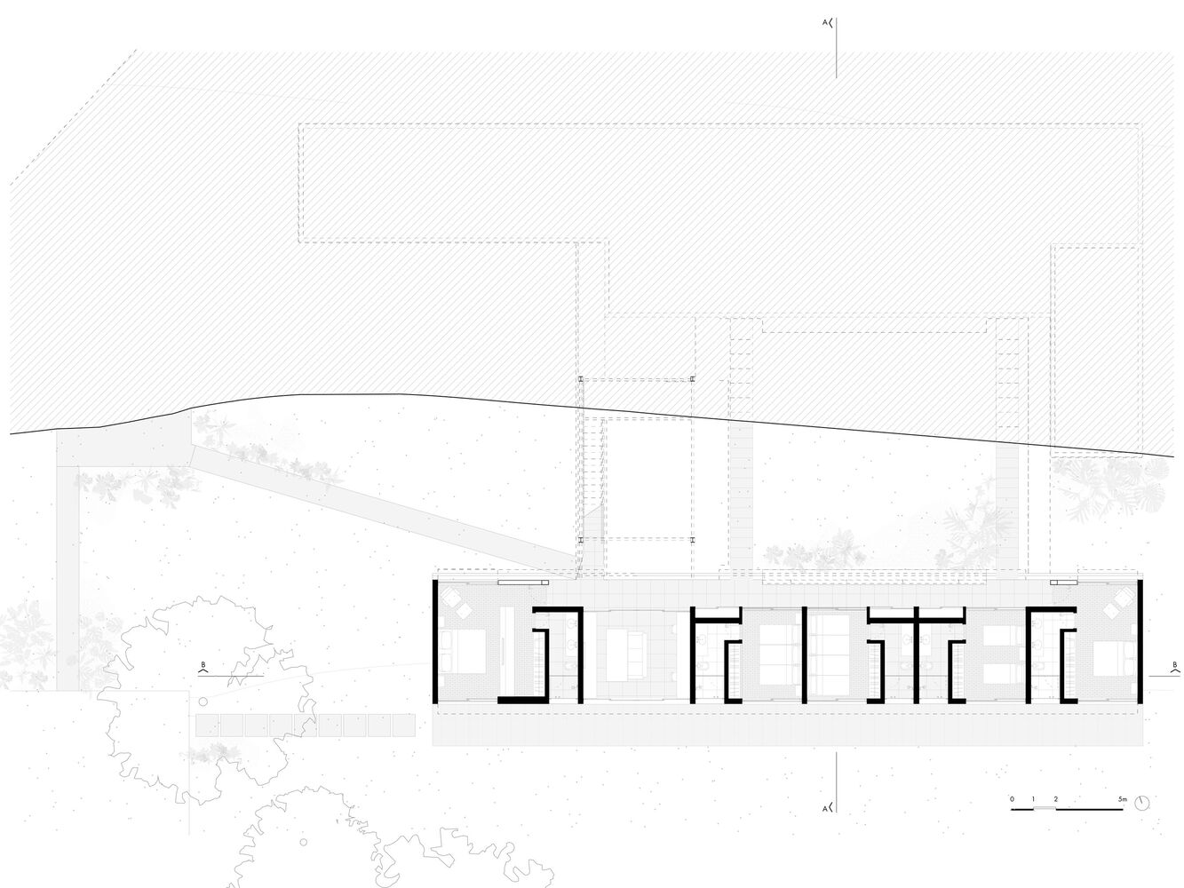 As a contrast to the predominant materiality, a slender metal structure pavilion connects the blocks, extending towards the slope of the land.