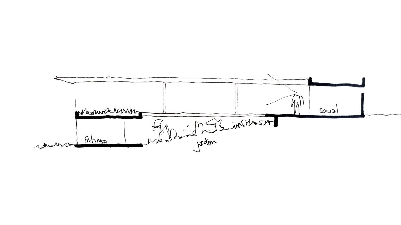 Built in reinforced concrete, it rises from the ground and supports a walkway that connects the garden terrace and the sauna, forming a circulation ring on the ground level. This arrangement provides greater internal flow and reinforces the spatial integration.