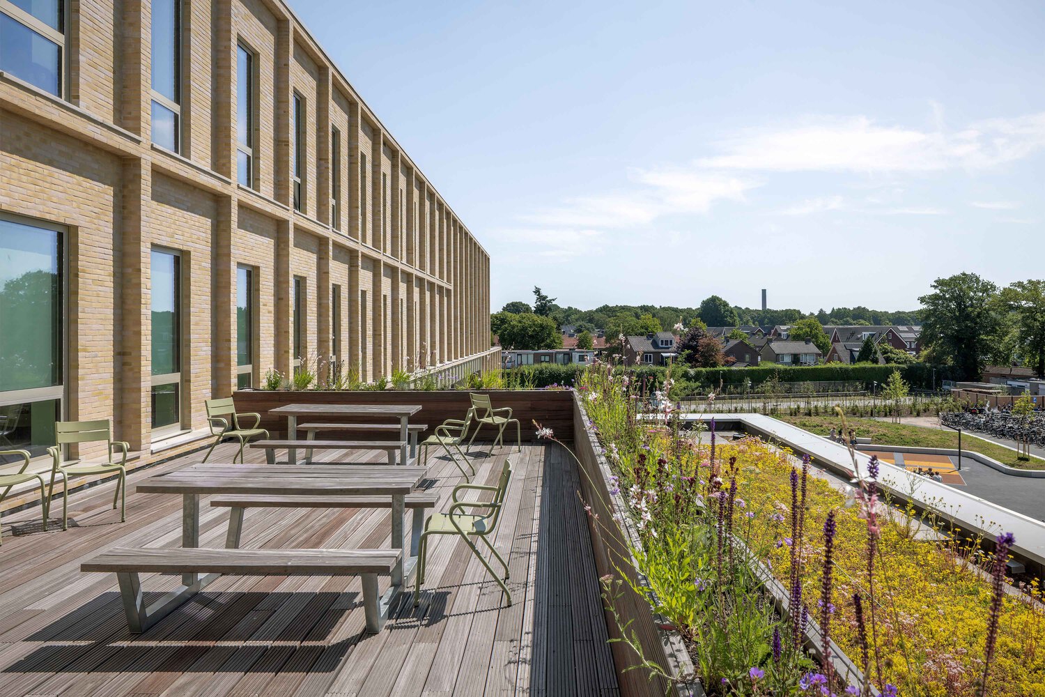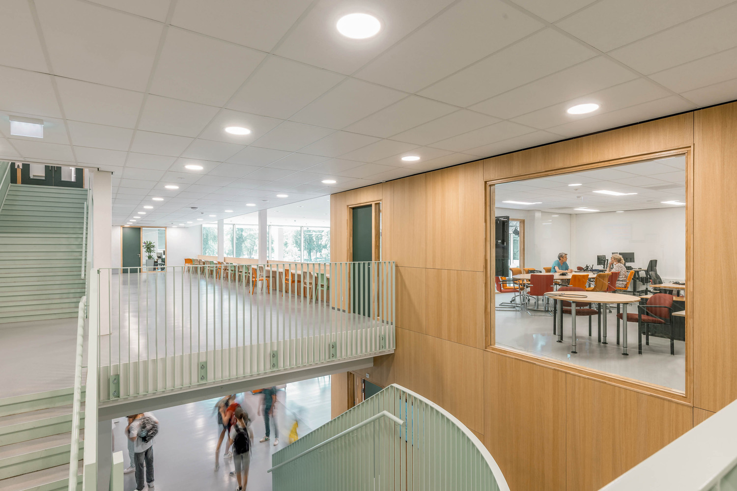Sustainability was a guiding principle from the start. The compact massing, articulated façades, solar panels, and gas-free installation result in an energy-efficient and healthy building that meets national 'Frisse School' standards.