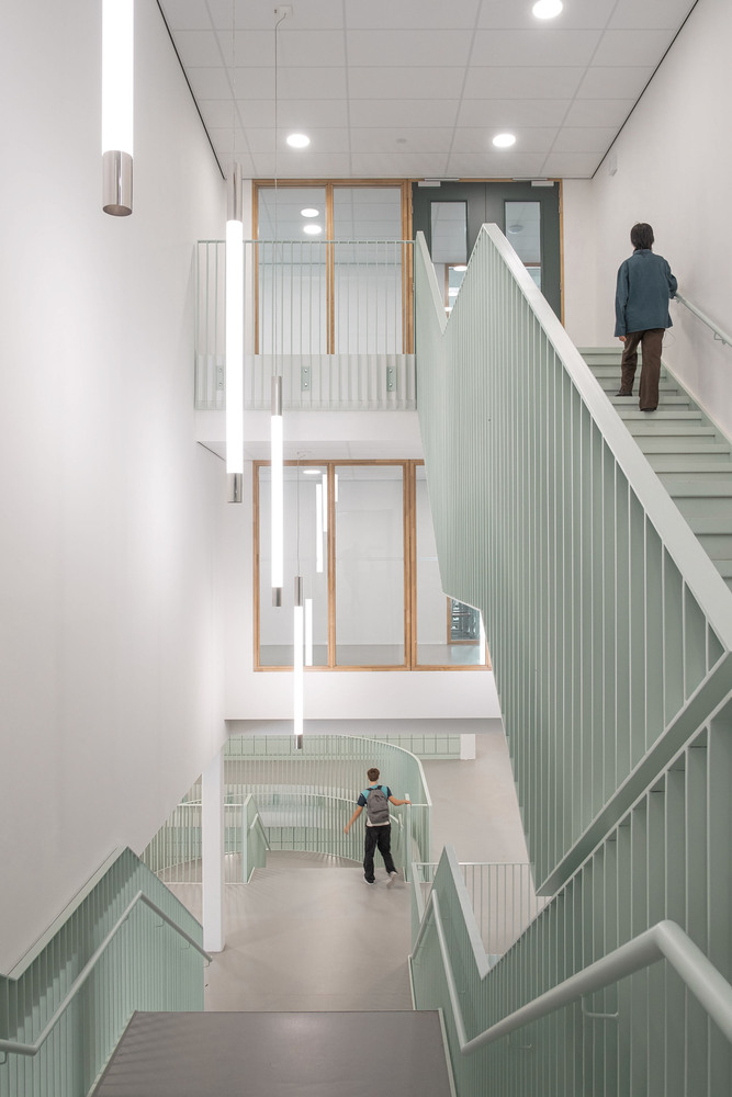 Inside, visitors are welcomed by a round reception desk, with direct views of the aula and a central staircase that connects all floors. In this way, the desire to 'design encounters' is thus made tangible.
