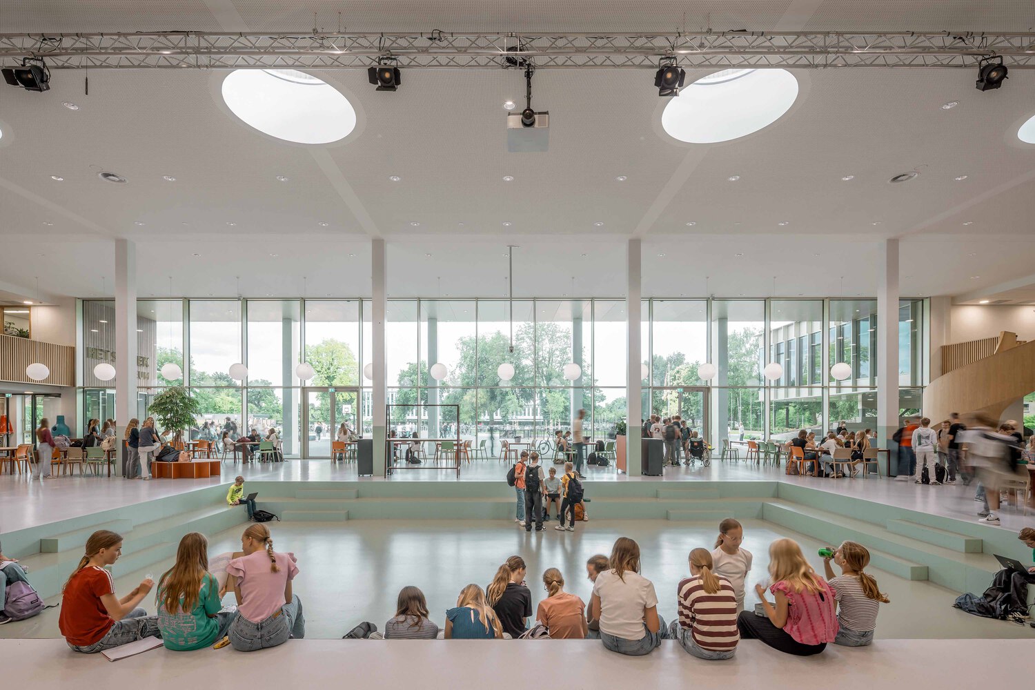 The spacious, light-filled aula forms the beating heart of school life. The generous space with height differences, seating areas, and sightlines, offers a variety of intimate gathering places.