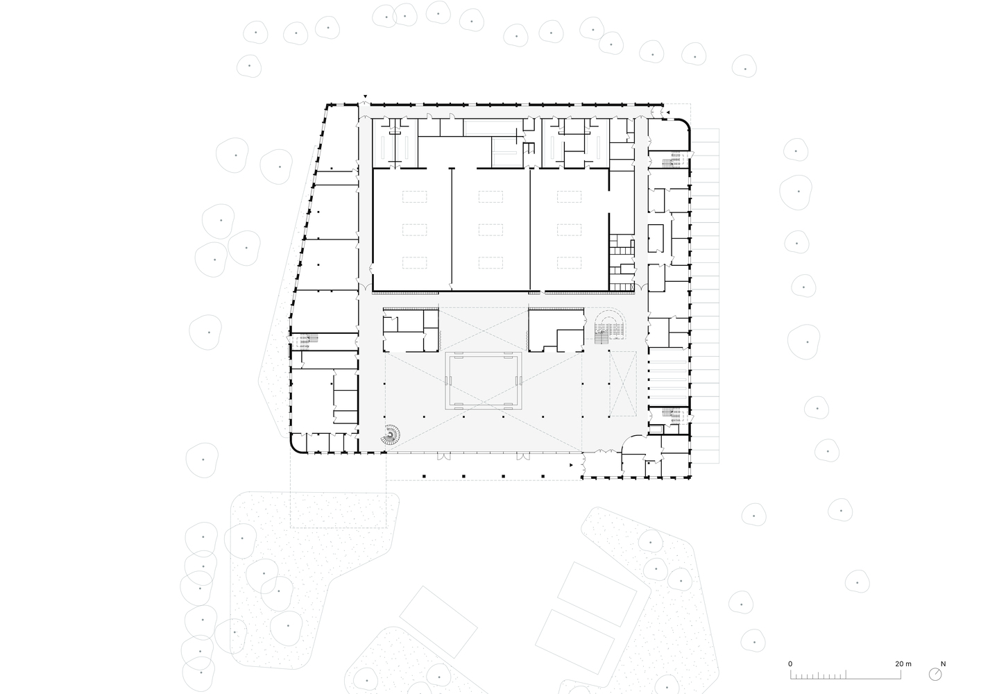 The eye-catching feature is the multifunctional wooden wall that opens up to accommodate various uses. The largest opening forms a stage, deliberately kept at ground level, while a lowered seating area naturally creates a theater.