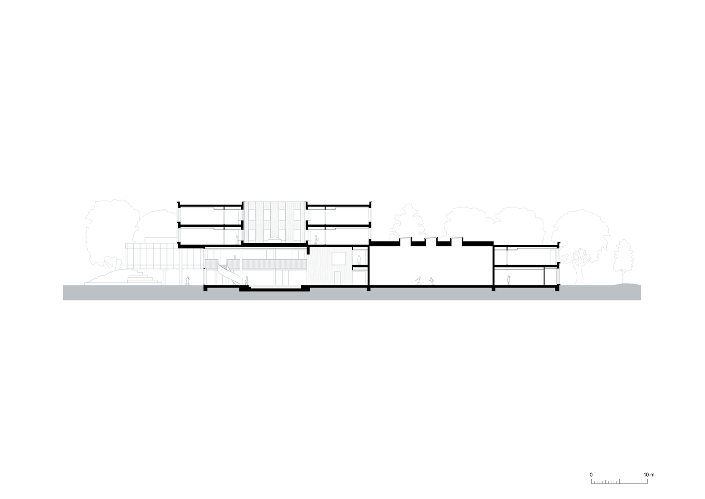 Its two- and four-story volumes respond to the scale of their surroundings, while façades of brick and recessed wooden panels create a layered relief and rhythmic expression.