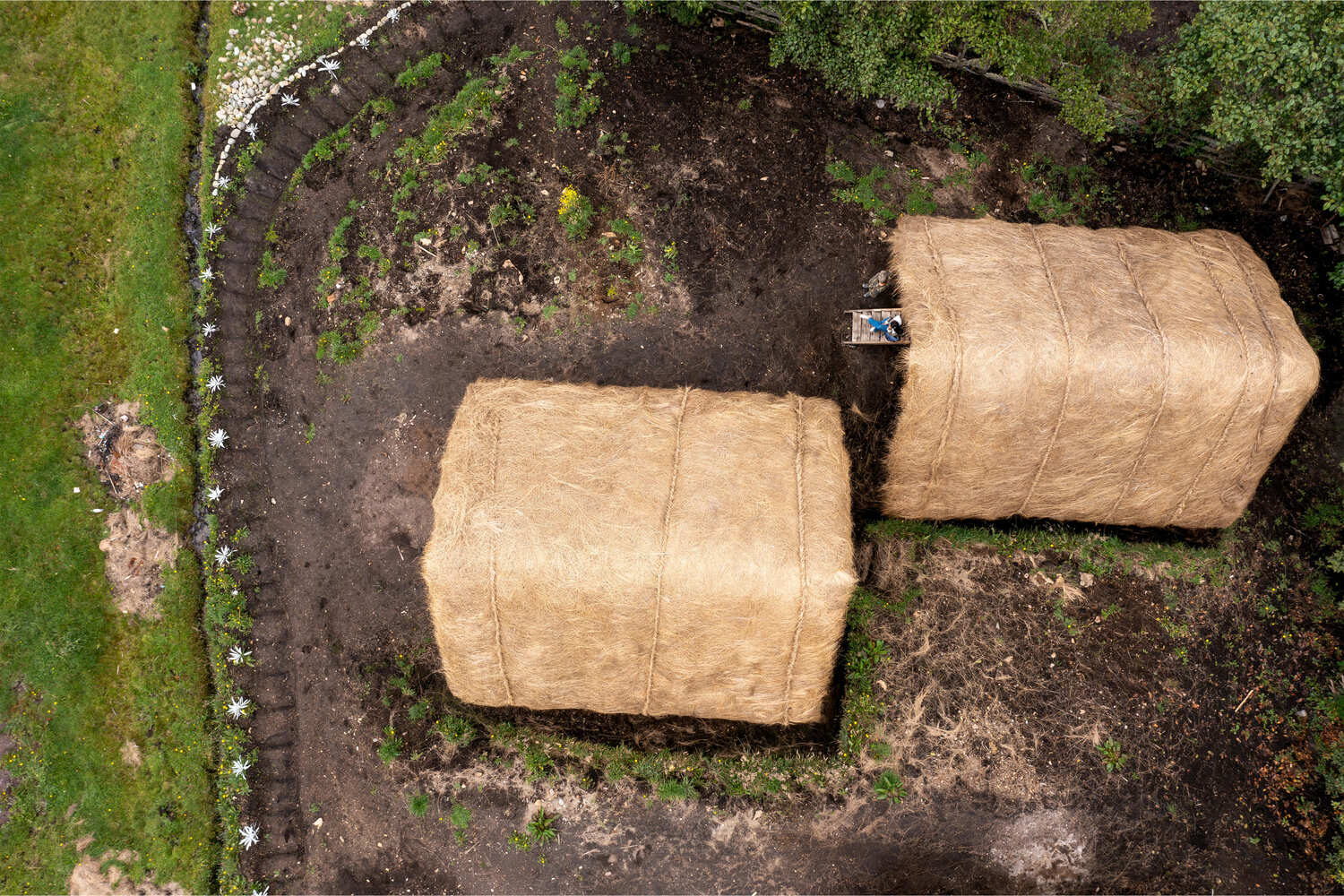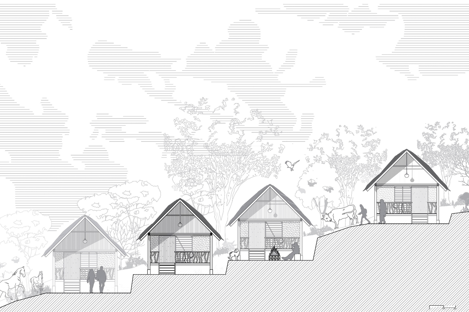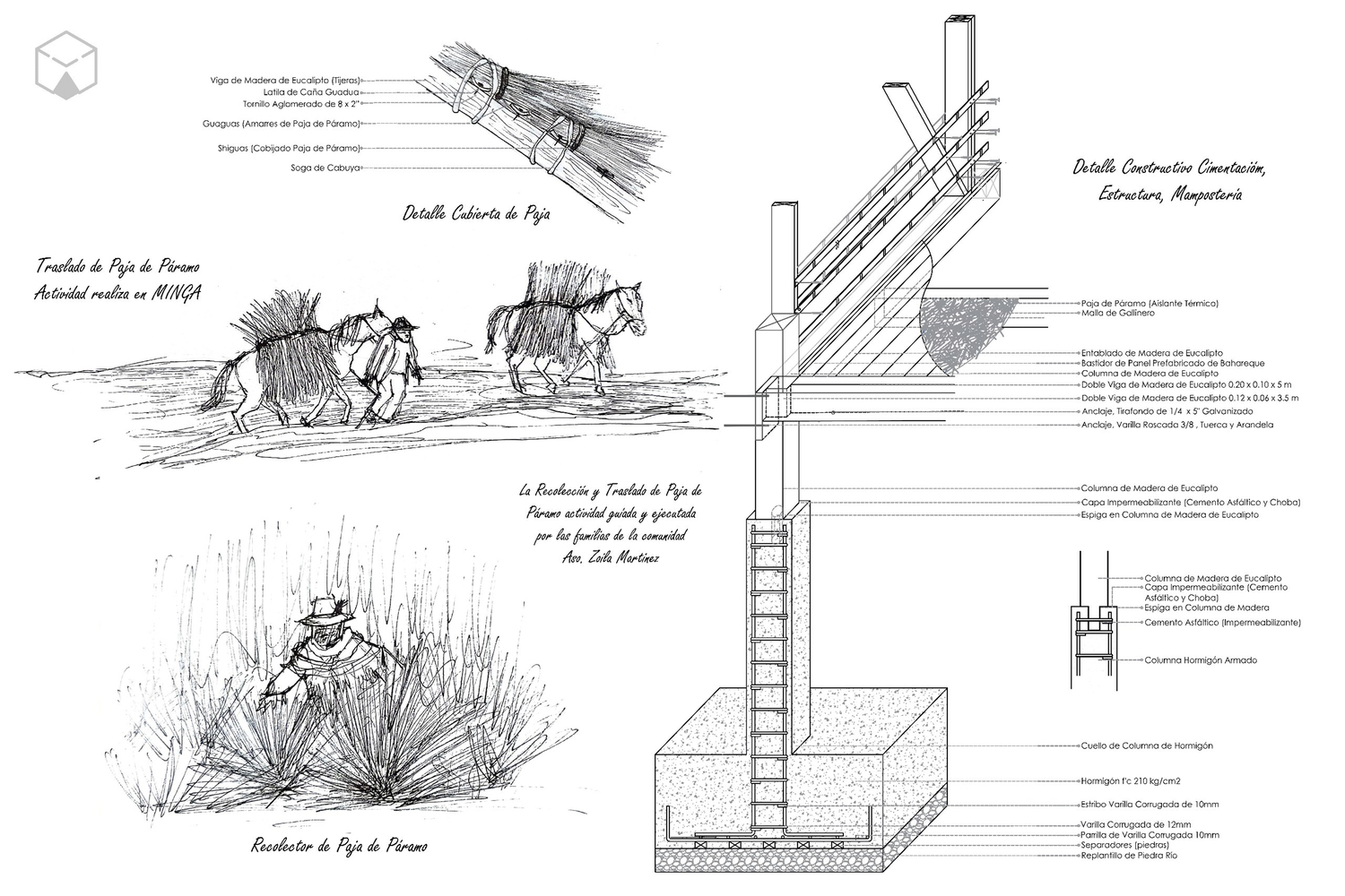 Furthermore, the modules are built on isolated reinforced concrete plinths, with eucalyptus wood structures, earth infill (filling panels with earth), and a roof made of wood and moor grass.