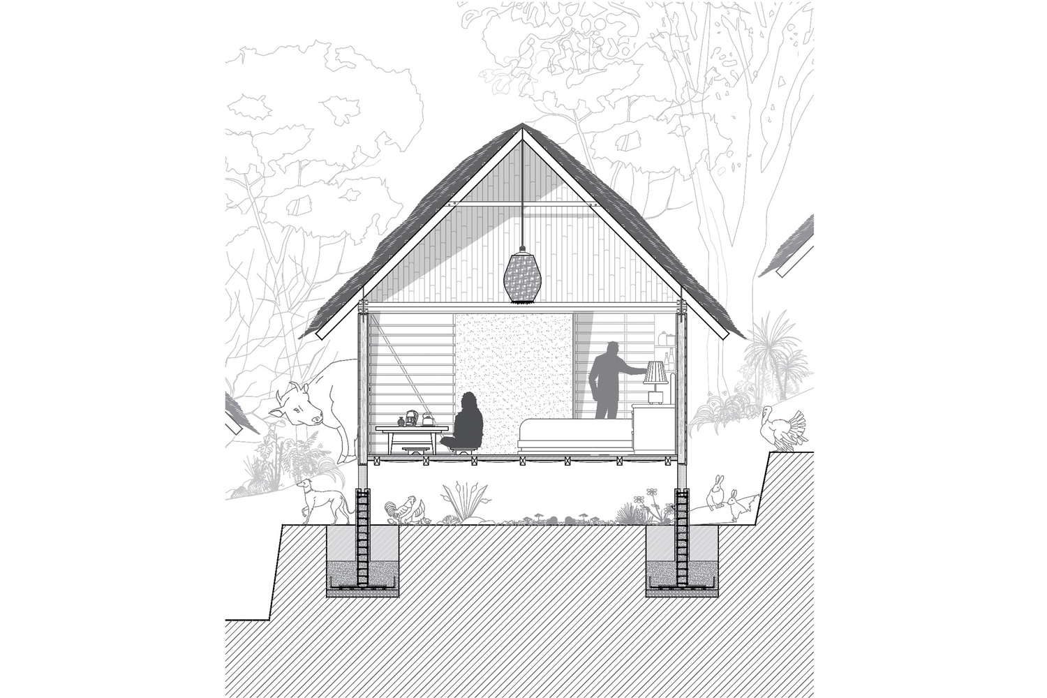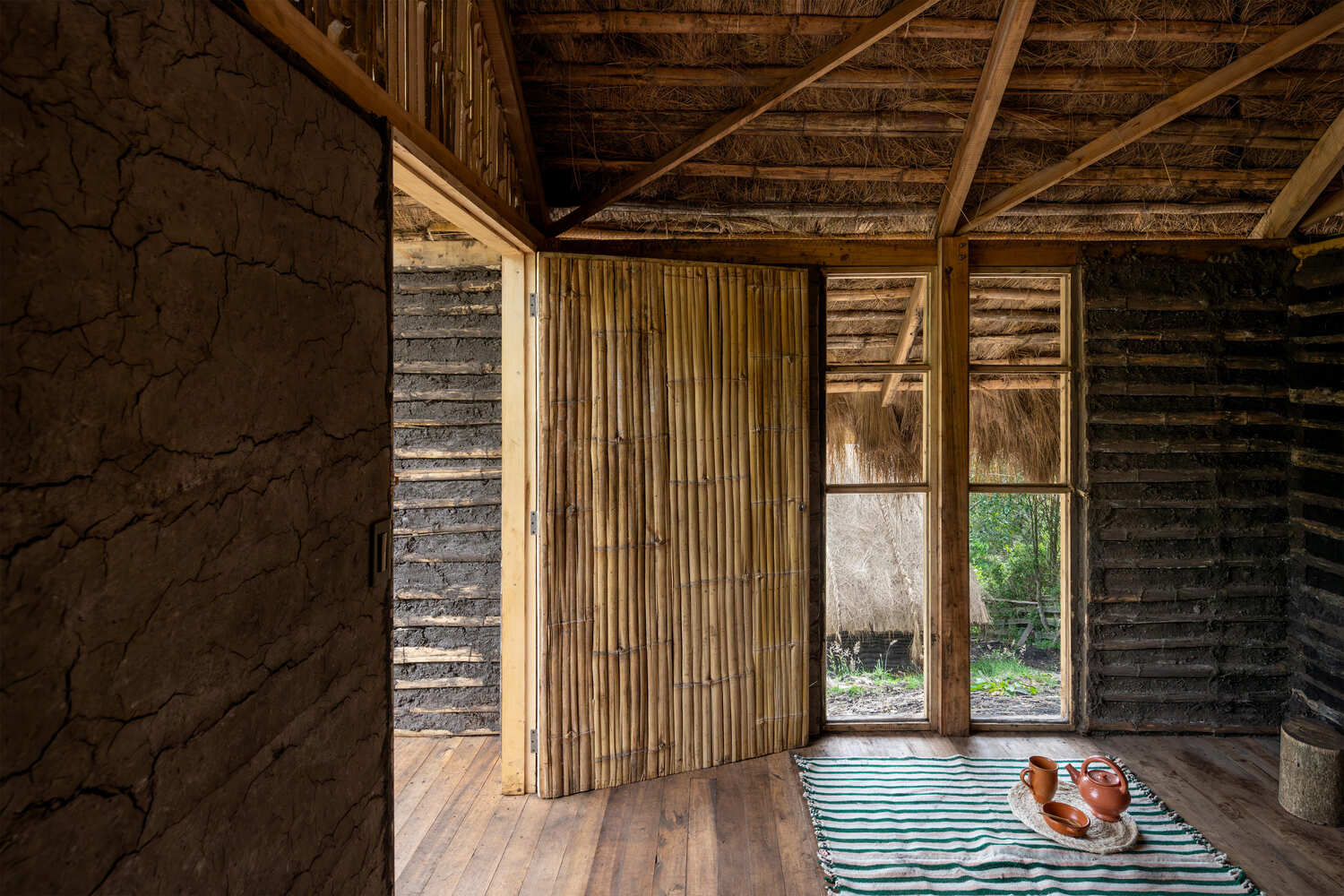 The typical traditional wattle and daub cabin has been reinterpreted, infused with expressions of innovative construction.