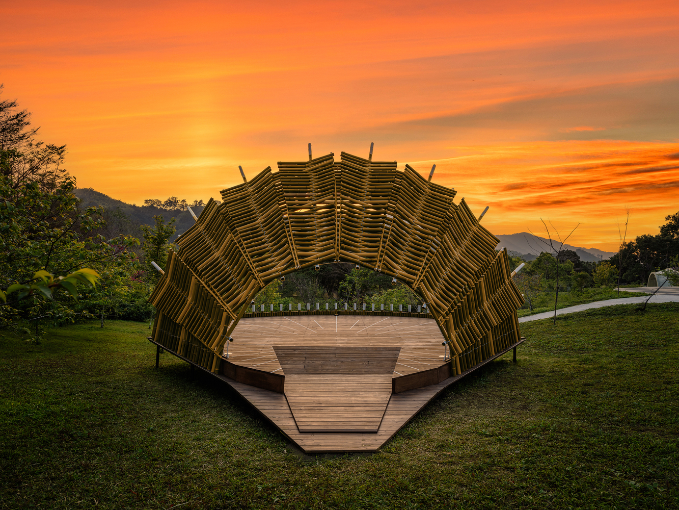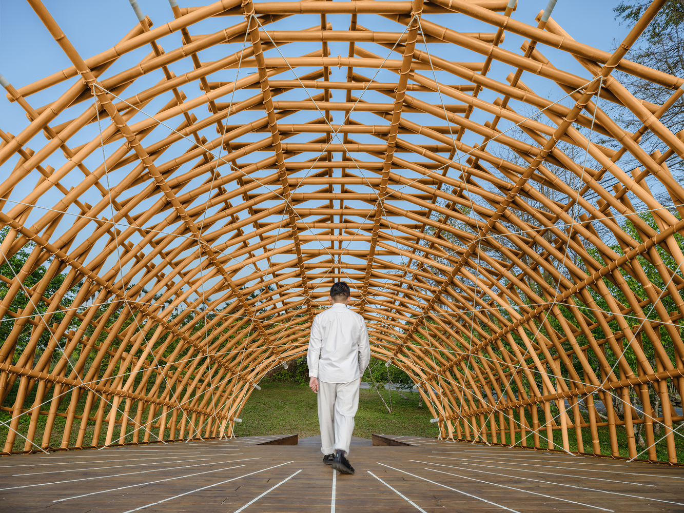 In his work Bamboo Theatre, created in Shima Park at Xiaobantian, Nantou, FENG reimagines this vanishing cultural symbol through the lens of contemporary stagecraft, employing bamboo, wood, metal, ropes, and tape — materials familiar to today's theatre-making.