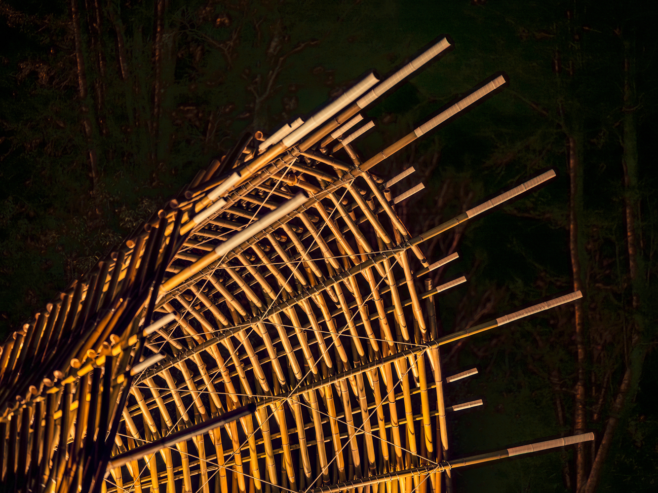 Within this overlapping framework, FENG wove together both thick and slender bamboo poles, binding them with net-like ropes.