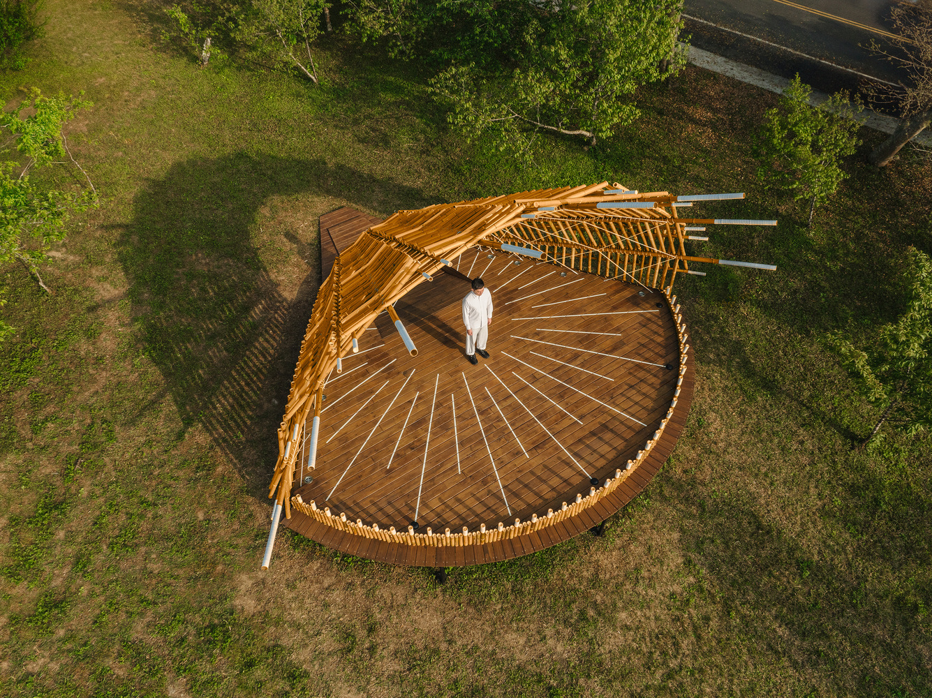 At the front edge of the platform, bamboo poles are neatly aligned, while strips of white tape decorate the ground, extending the radiating geometry of the stage into its surroundings.