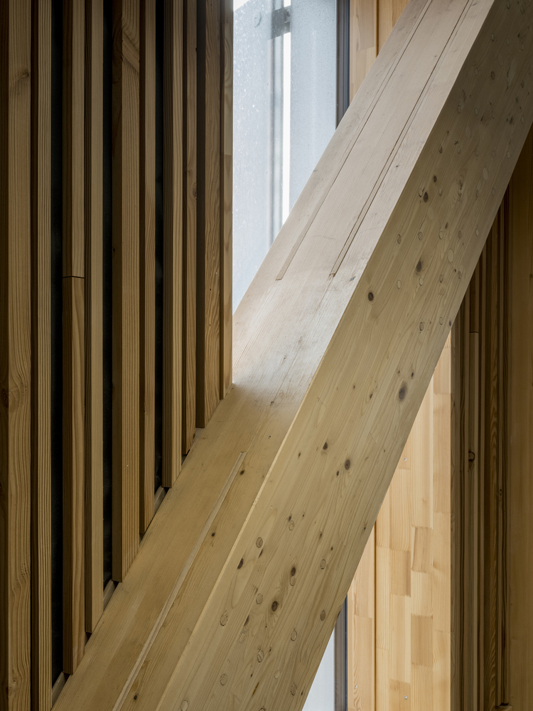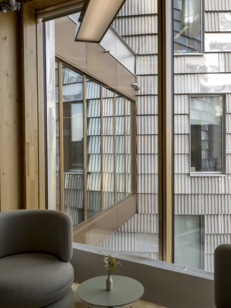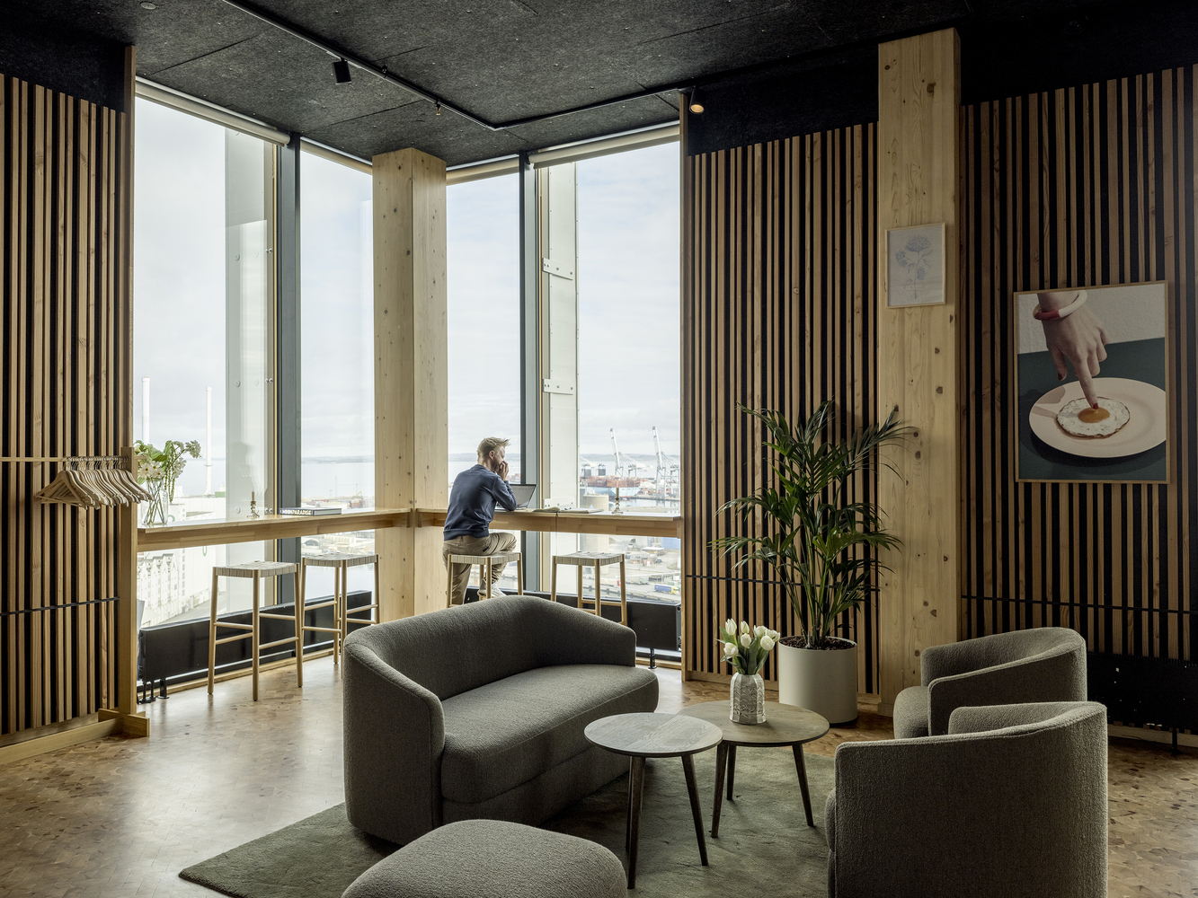 Structurally, TRÆ combines glulam columns and CLT floor slabs, with low-carbon concrete cores ensuring stability and fire safety. Nearly all visible surfaces are reused, upcycled, or biobased.