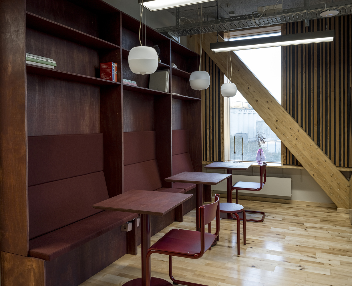 Interior finishes include reclaimed timber flooring and panels, while mature trees relocated from municipal sites reinforce the "tree" concept and create an immediate green setting. User studies and indoor climate measurements confirm that the spaces feel healthy and inspiring.