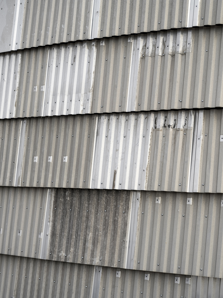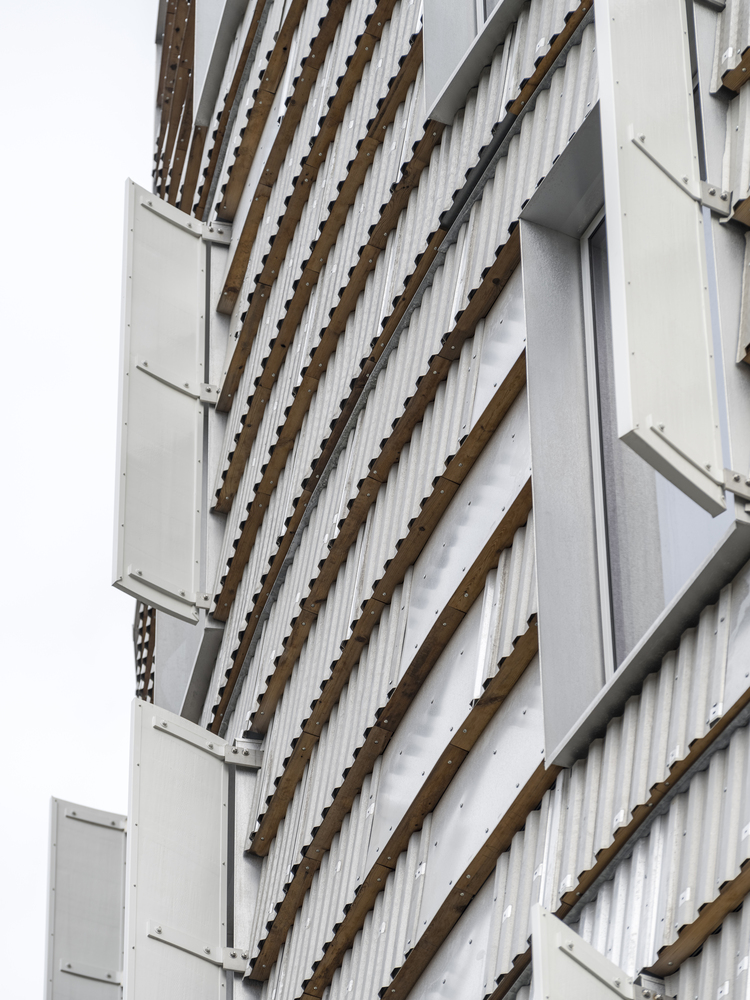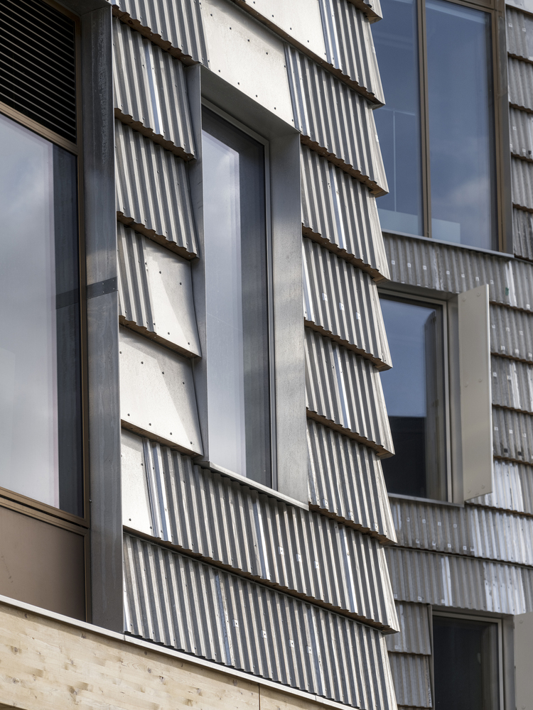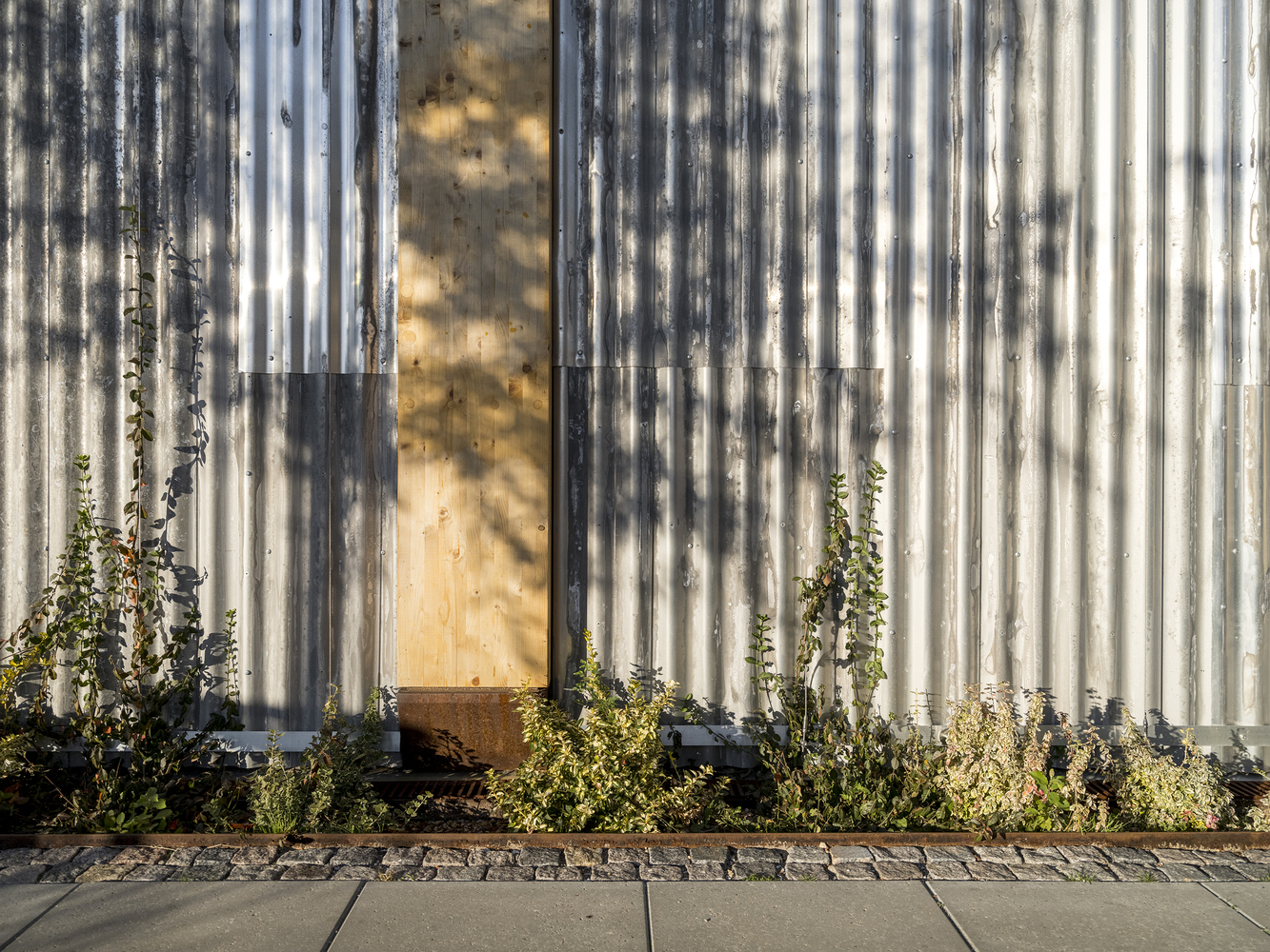 Timber cassettes form the façade, clad with aluminium sheets salvaged from industrial and farm roofs and water-damaged post boxes.