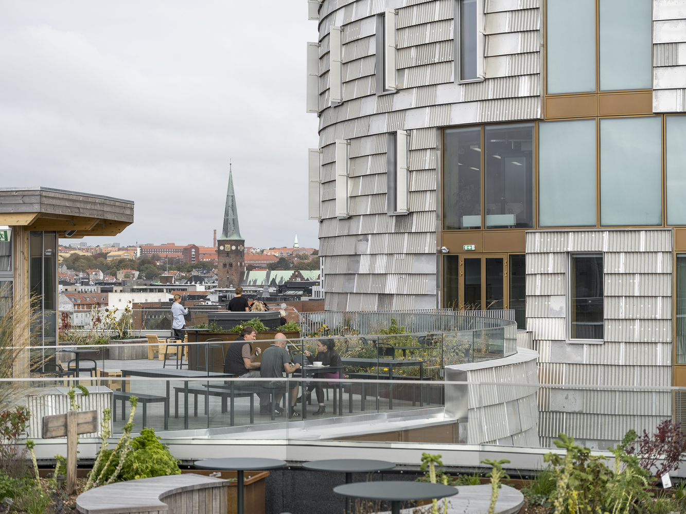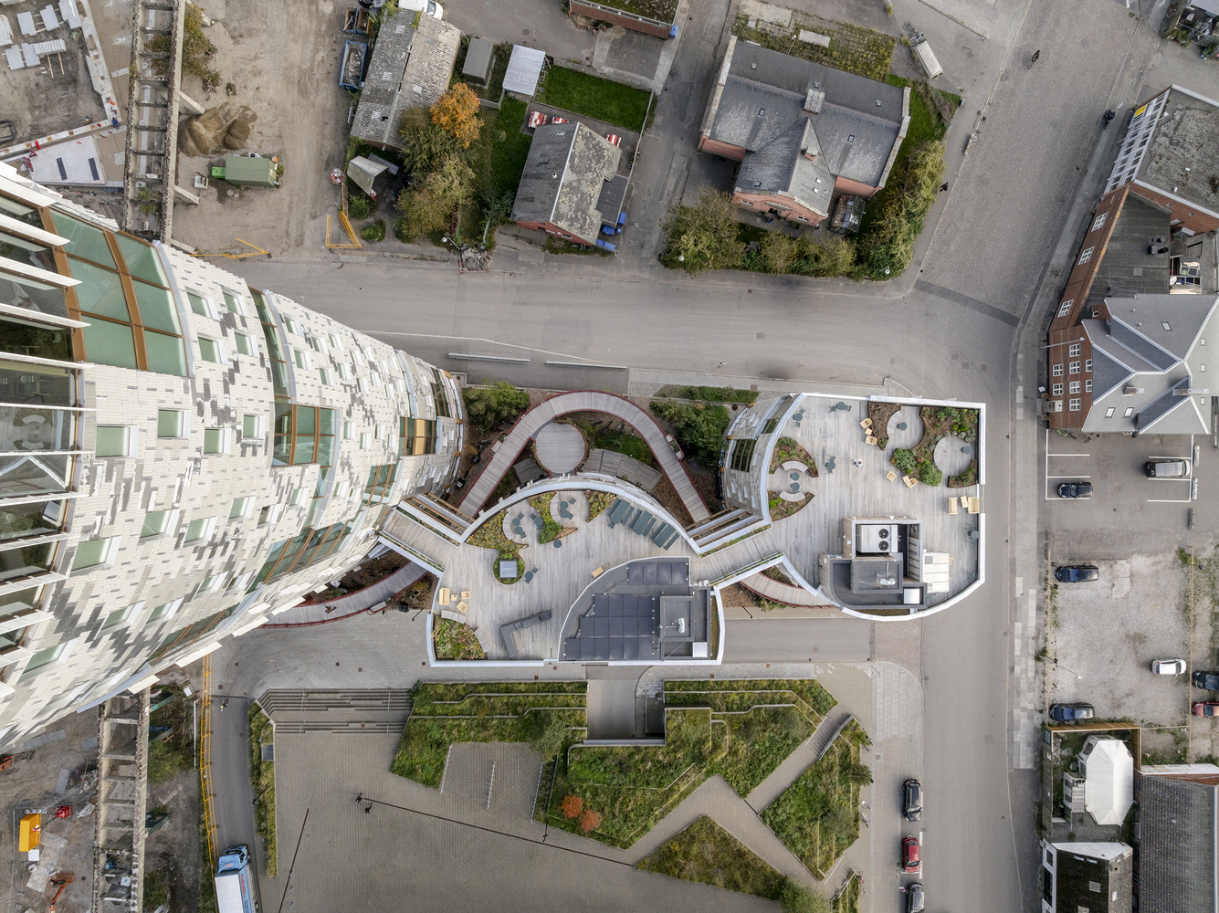 An undulating pedestrian bridge links the ground level to Aarhus's new highline, weaving the building into the city's fabric and inviting public interaction.