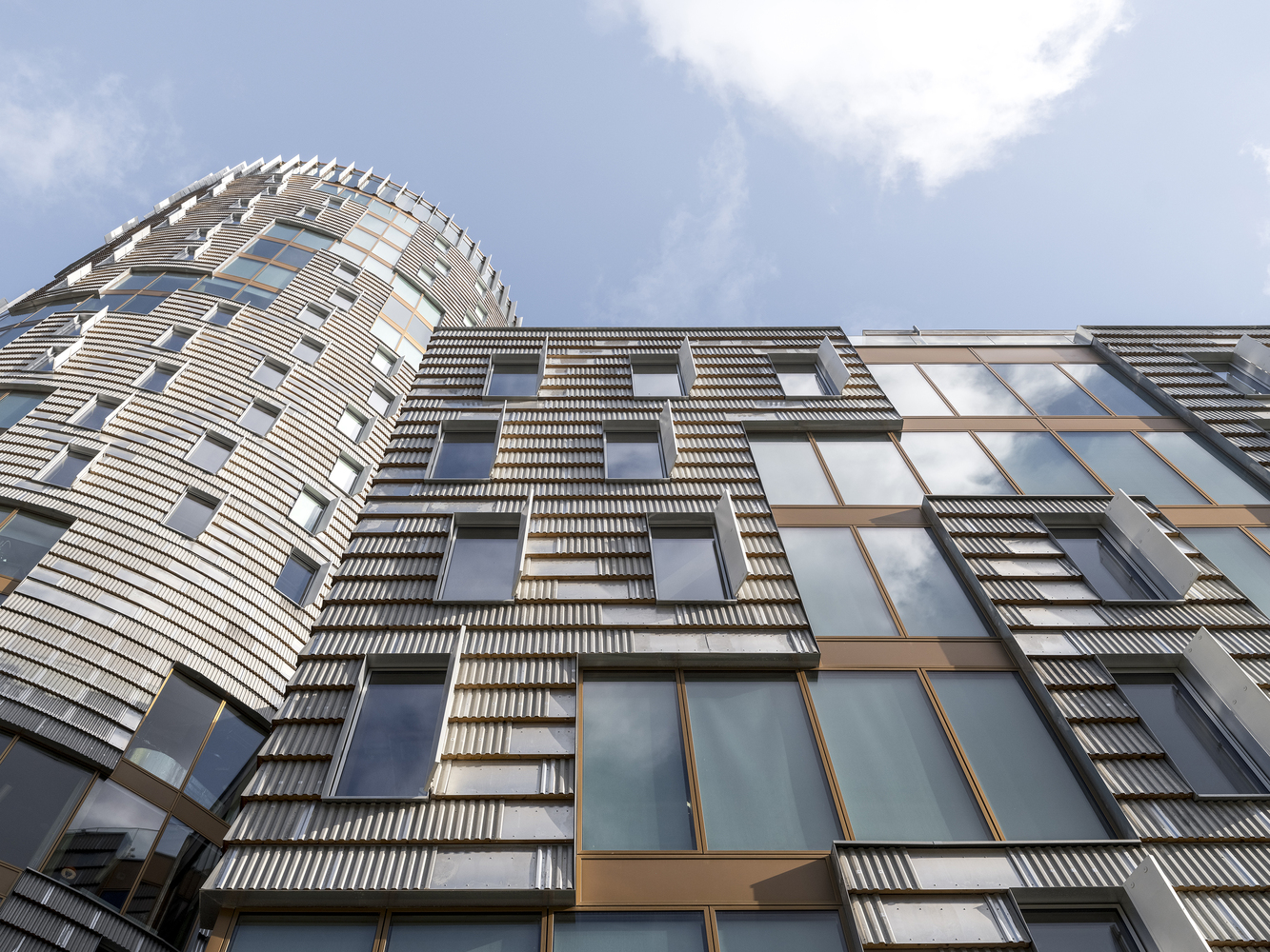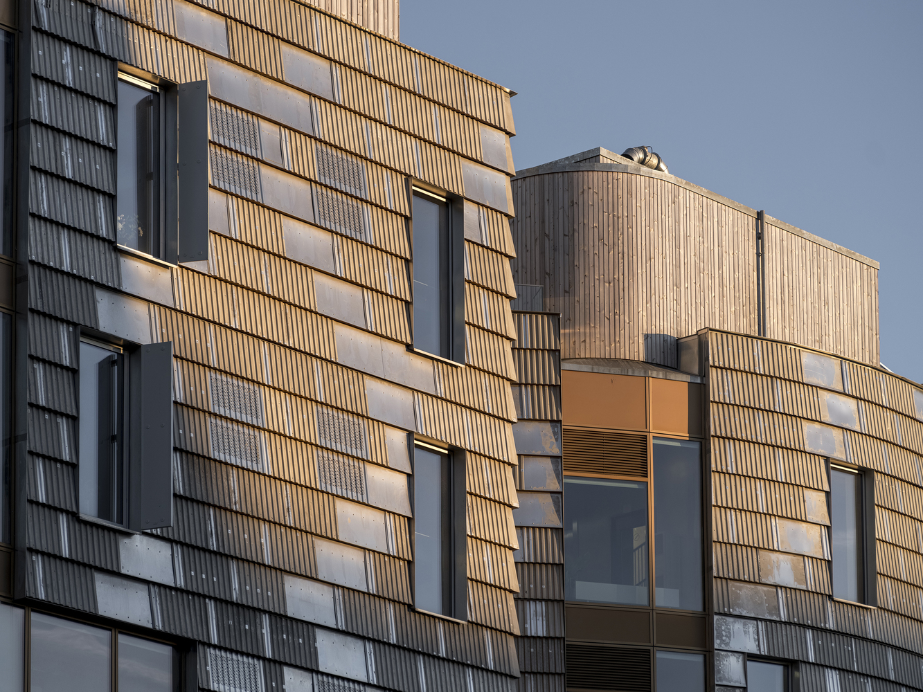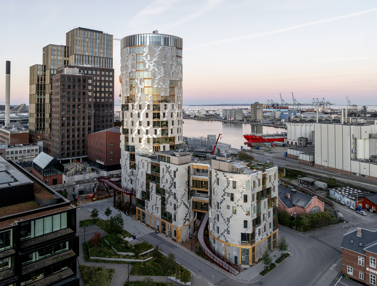 Located in Aarhus's former industrial harbor, TRÆ responds to its raw context with facades made from salvaged aluminium sheets arranged to evoke birch bark: mottled, imperfect, and alive.