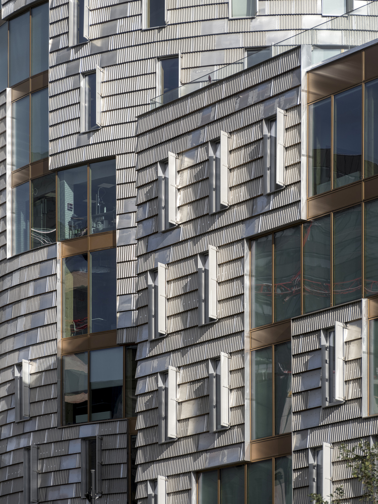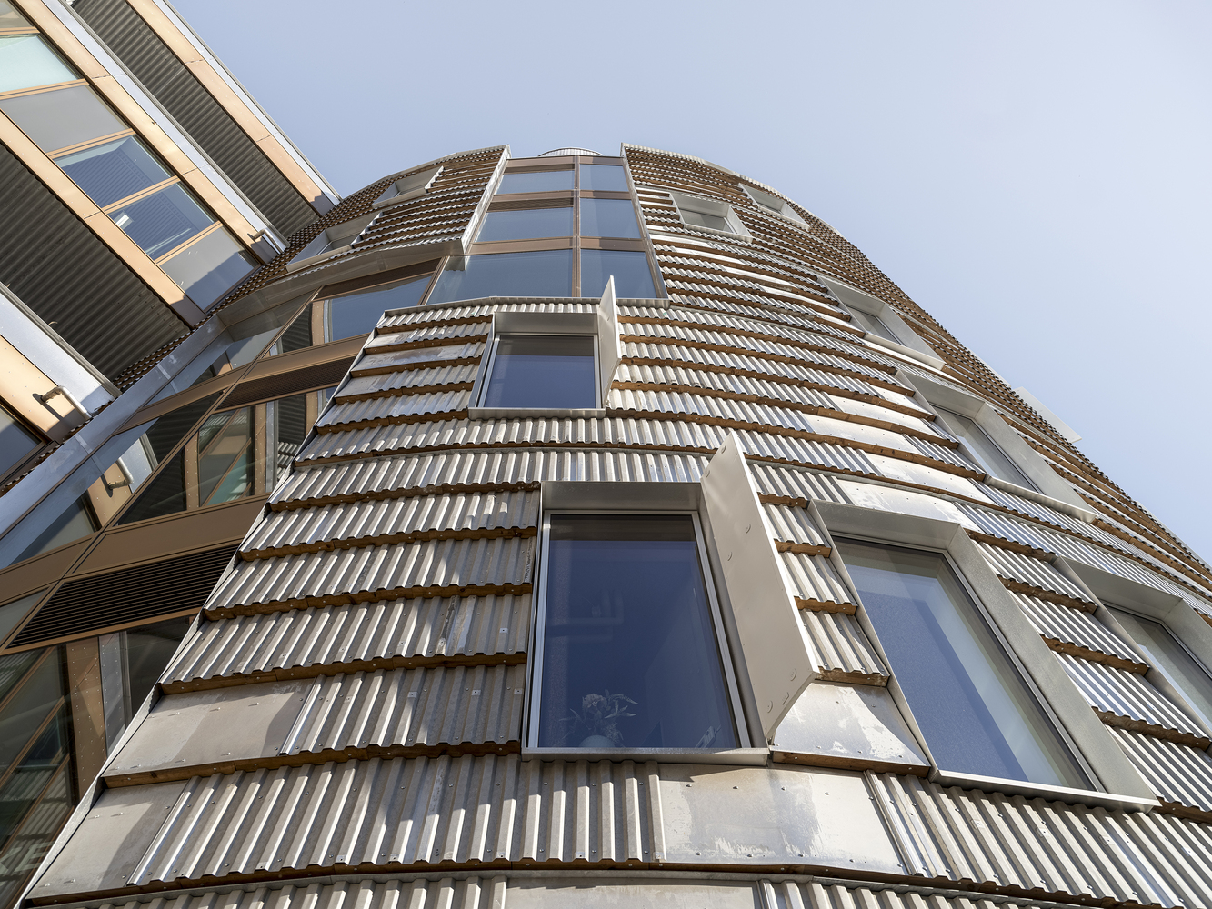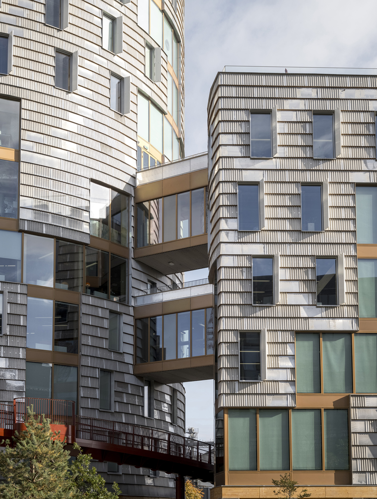 Located in Aarhus's former industrial harbor, TRÆ responds to its raw context with facades made from salvaged aluminium sheets arranged to evoke birch bark: mottled, imperfect, and alive.