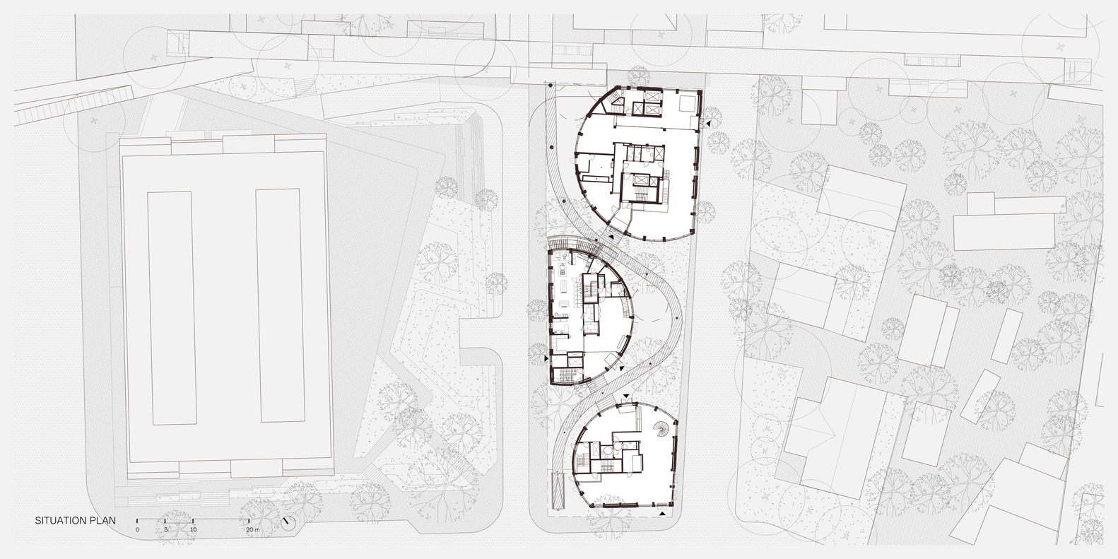 Ground-floor functions, including a restaurant operated by a social initiative, activate the street, while the "snake" walkway draws people into the site.