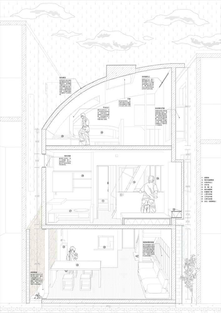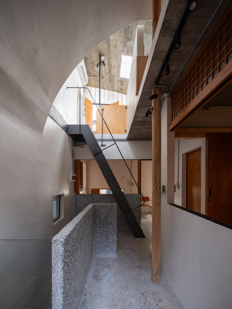 The design preserves and reconstructs the old walls, employs a curved roof to alleviate a sense of oppression, and creates a miniature garden pool.