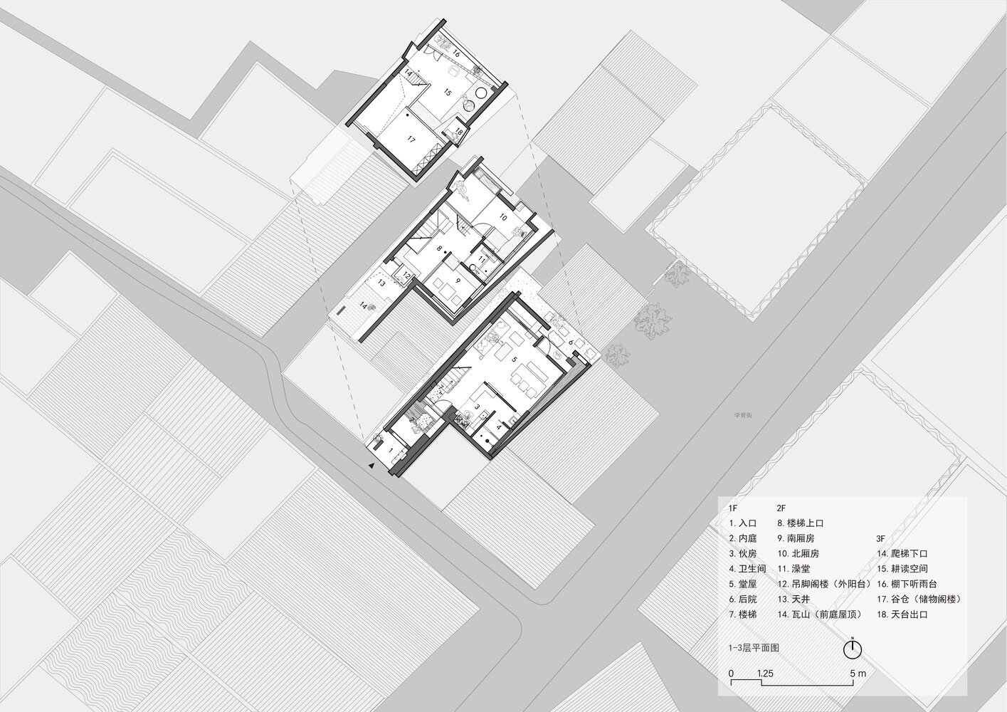The architecture is anchored in the historical texture of the site, while spatial prototypes like "ladders," "central columns," "barns," and "garden pools" are reinterpreted in a contemporary manner.