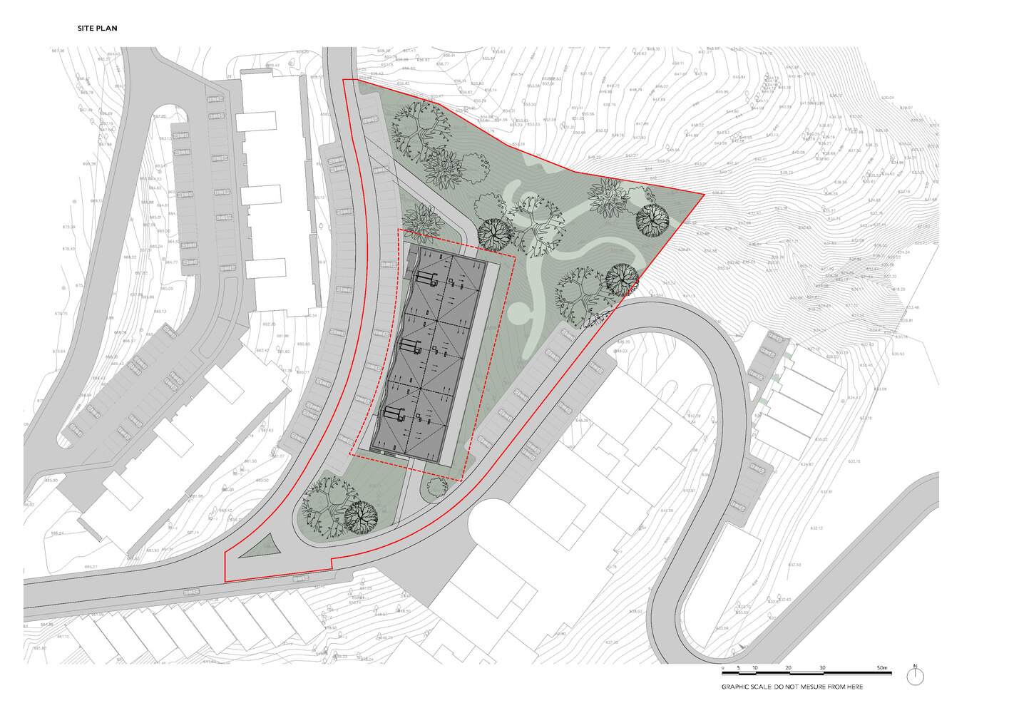 The sloping terrain enables discreet integration of parking and elevates residential floors to enhance views, resulting in a modular yet expressive form that balances environmental responsiveness, regulation, and quality of living.